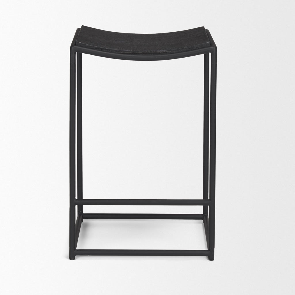 The Taniel Counter Stool is constructed from matte black iron tube metal with a contoured light brown solid wood seat.