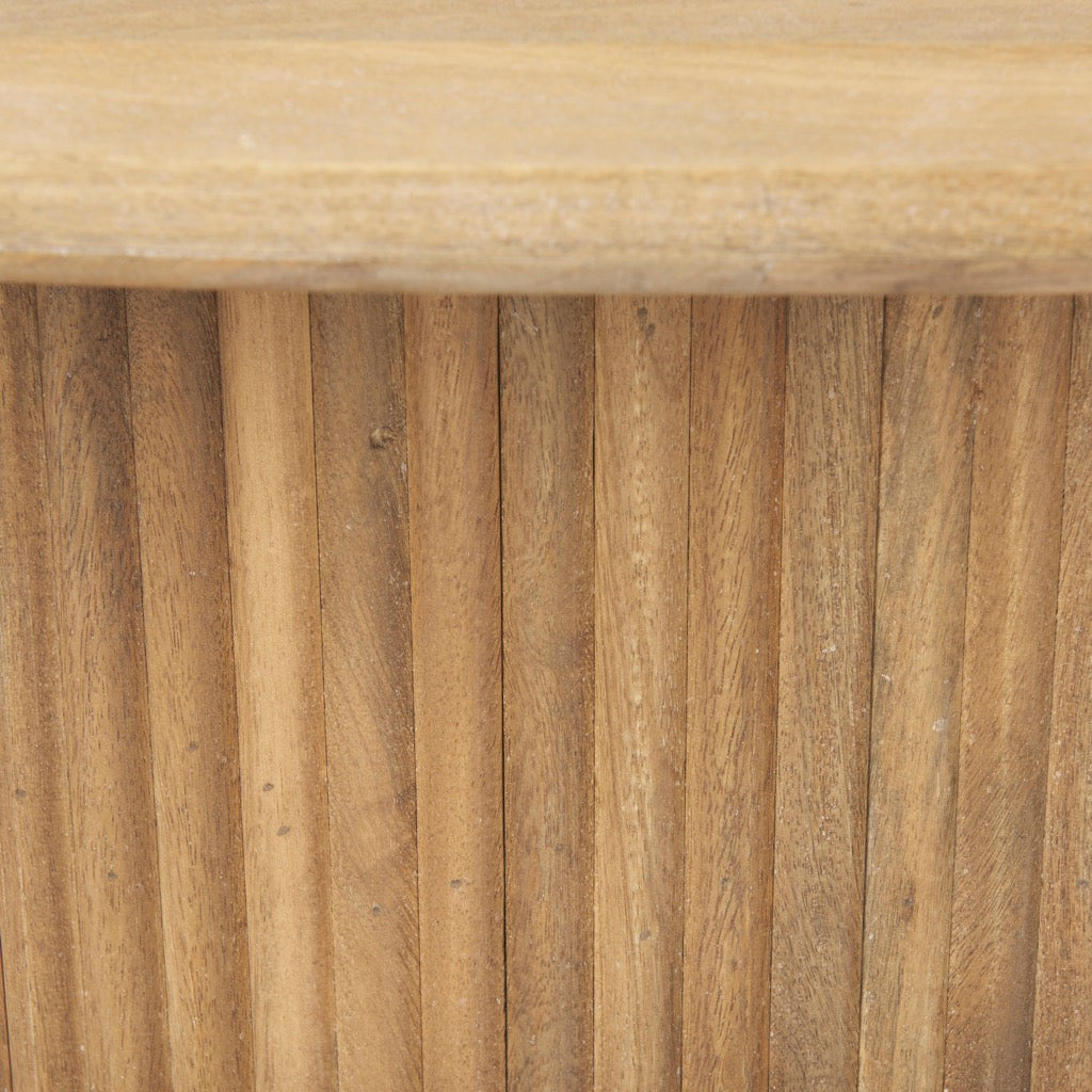 A solid wood, contemporary coffee table that features a smooth round top and a fluted round base with a hydraulic lift top and storage compartment.
