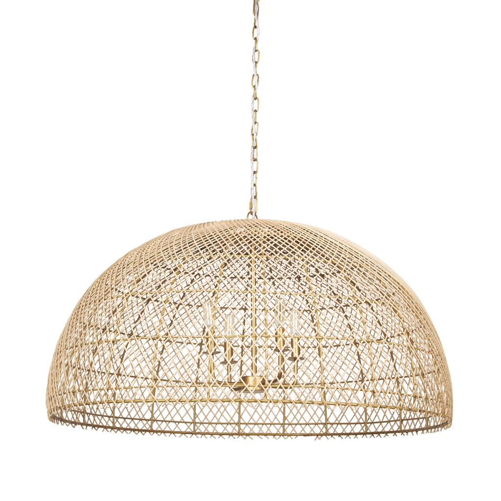 Thad is a 4-light Dome Chandelier with a delicately woven rattan shade and a gold finished metal frame and chain.