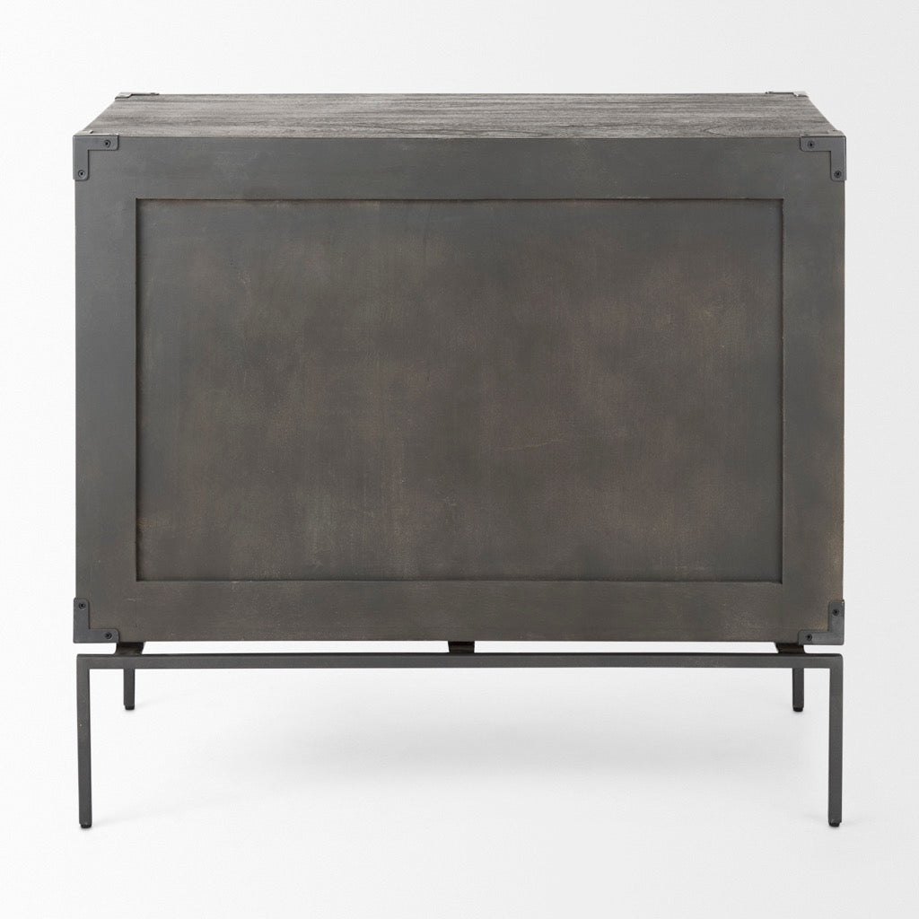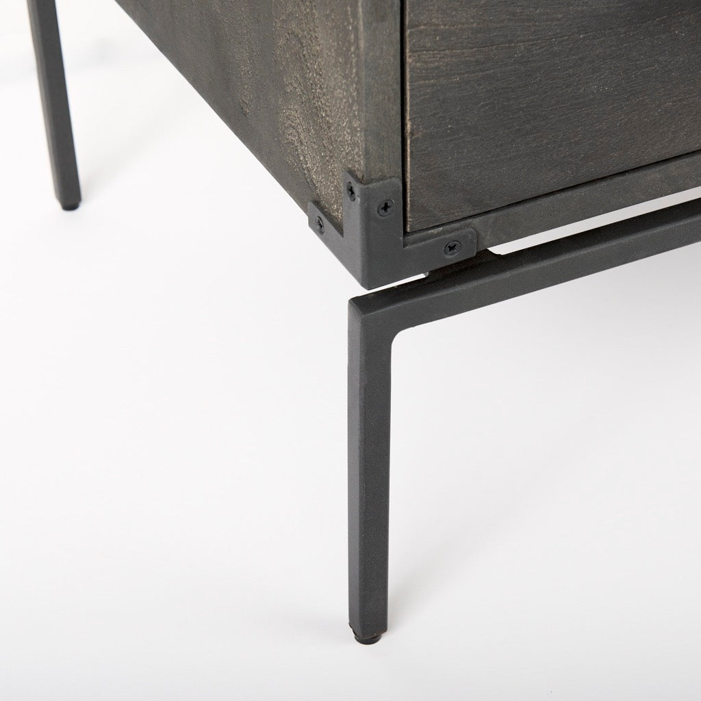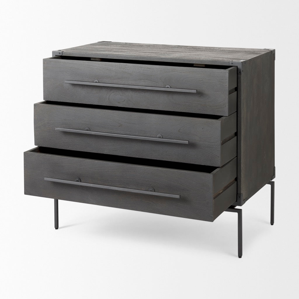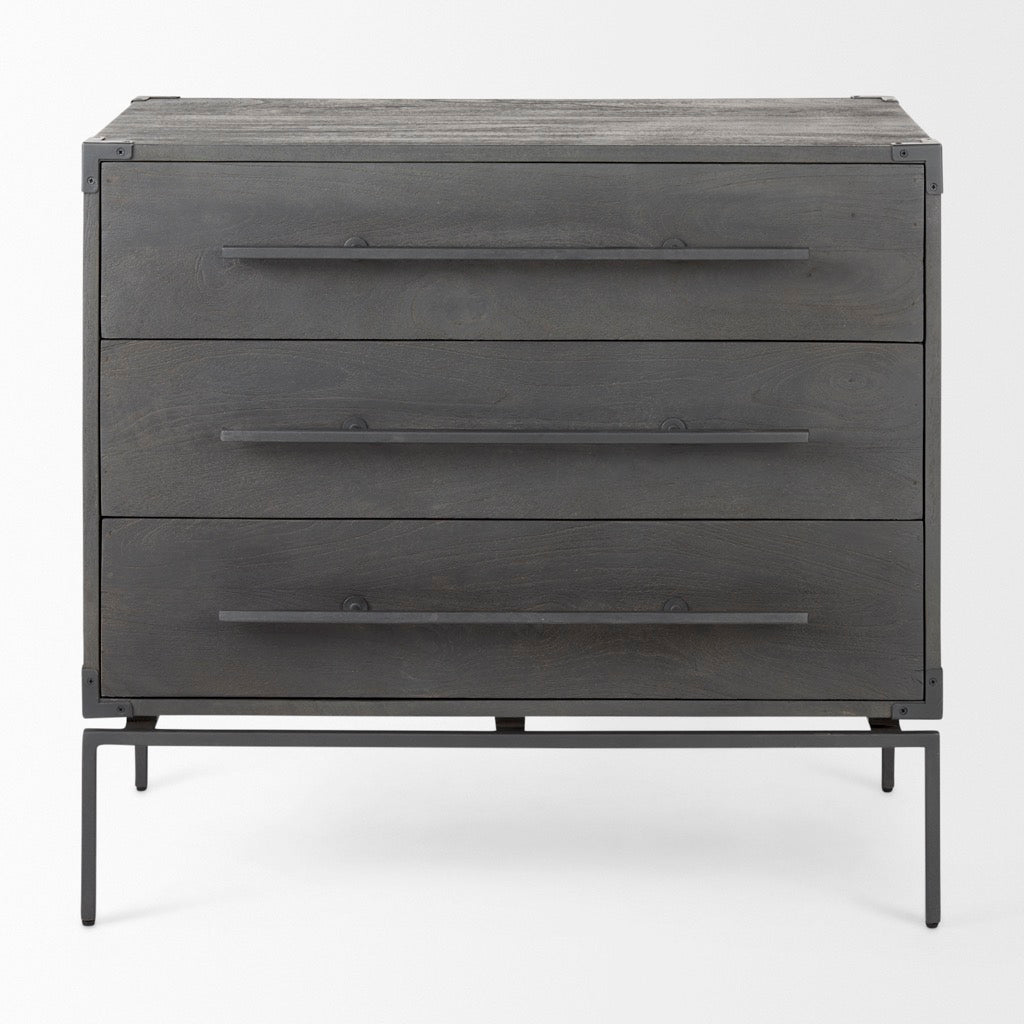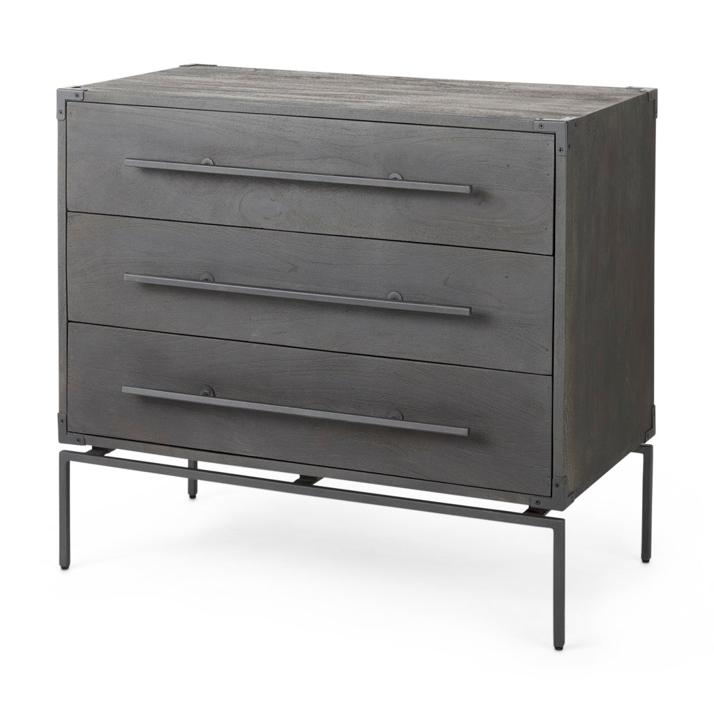 The Ward is an elegant, three-drawer wooden chest with an iron base and handles.
