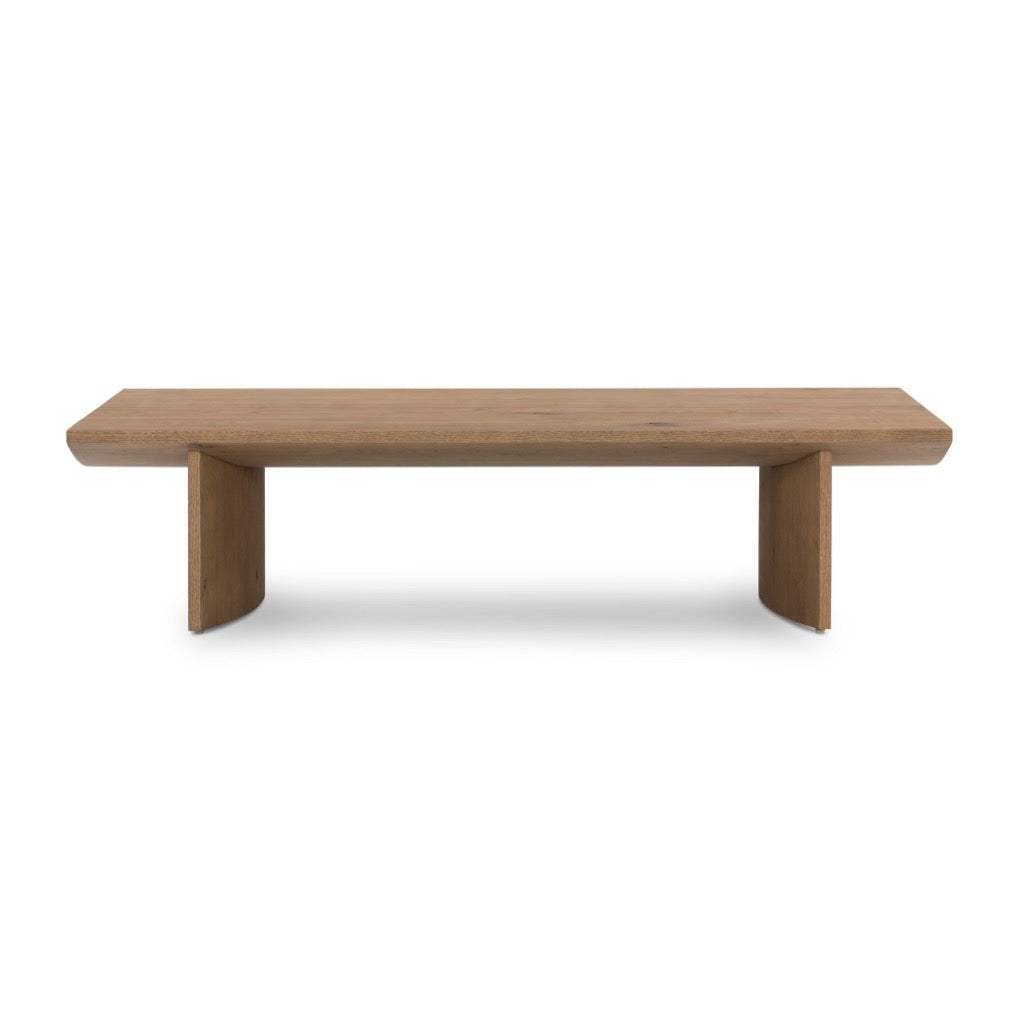 Low-styled and shape-driven, a coffee table made from thick-cut oak veneer features overscale proportions and half-moon shaping, with a warm grey-brown finish.