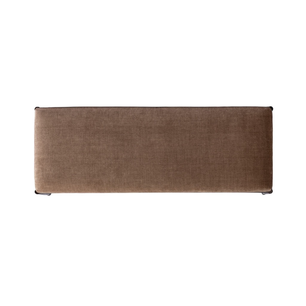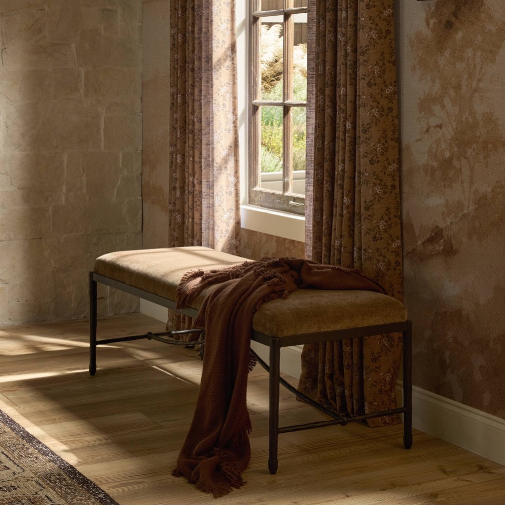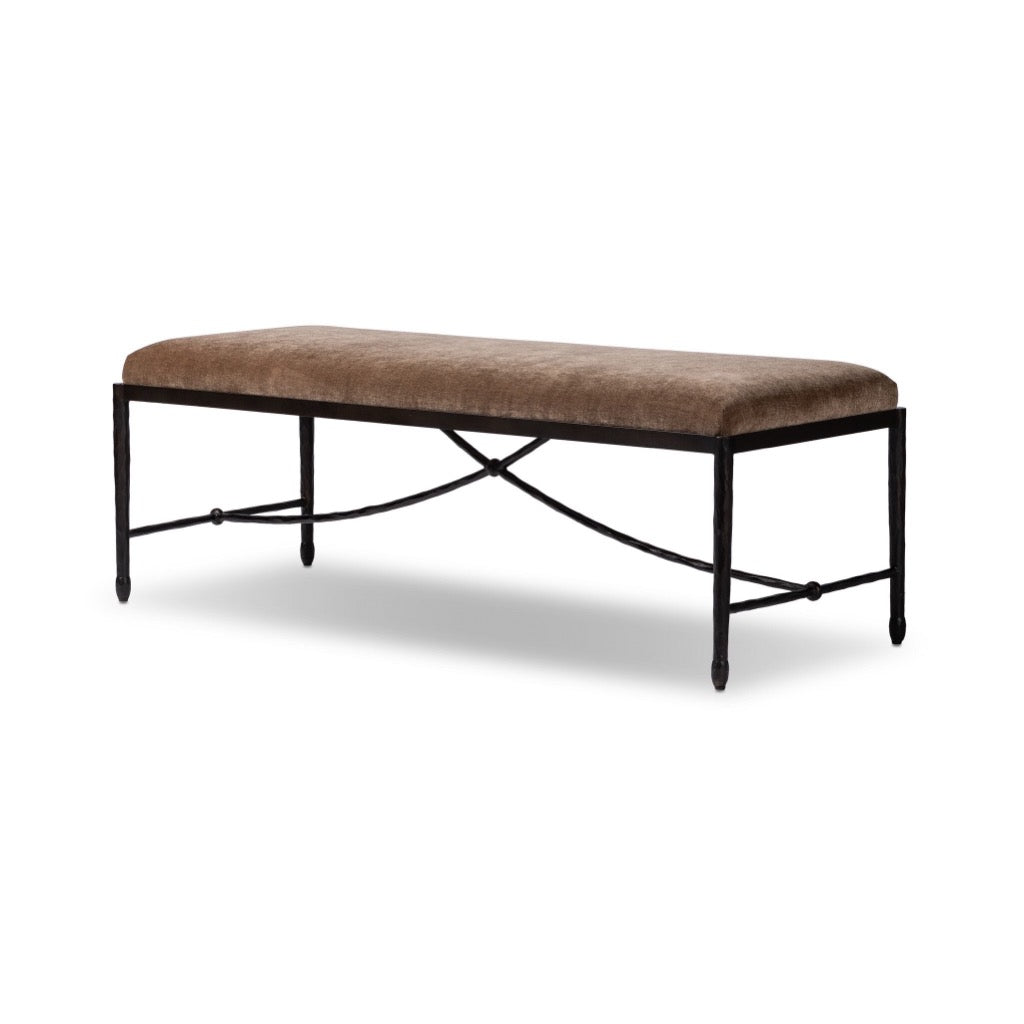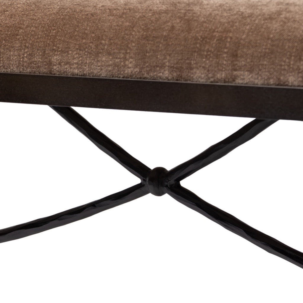 Channel Art Deco with a curved stretcher base of bronzed hammered iron and a velvety seat in a versatile earth tone. Style in the bedroom or entryway to create an extra surface, or in your living space for bonus seating.