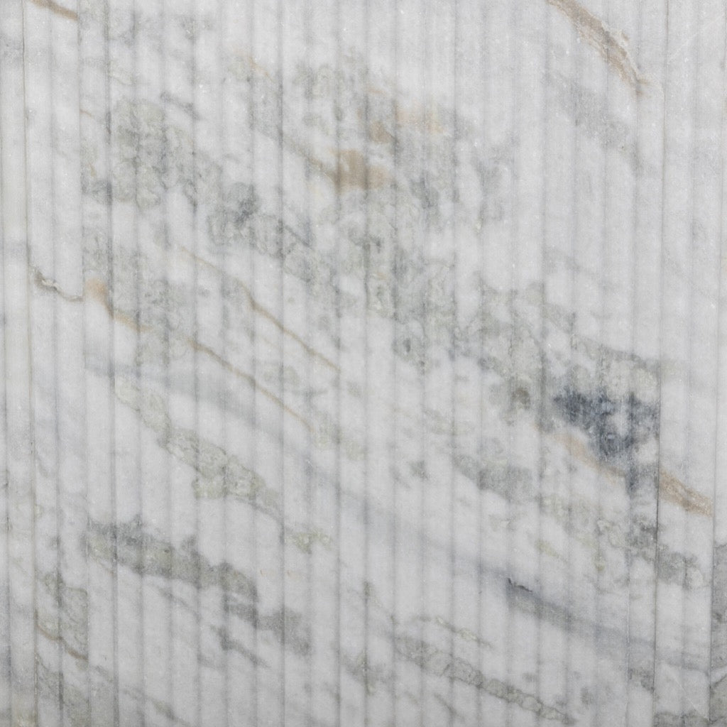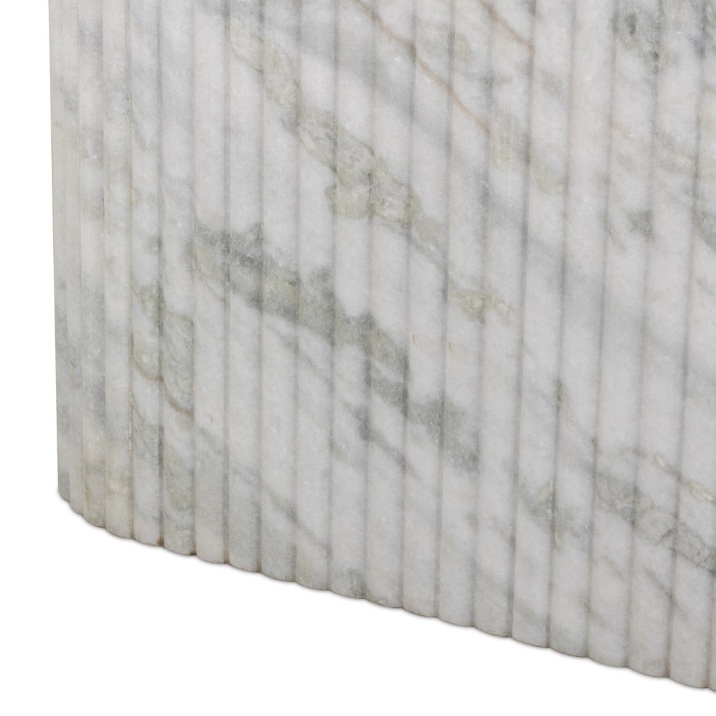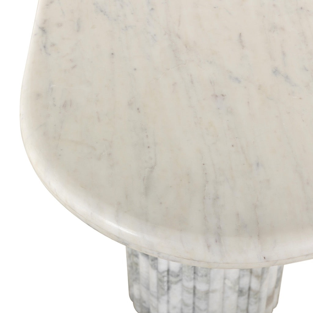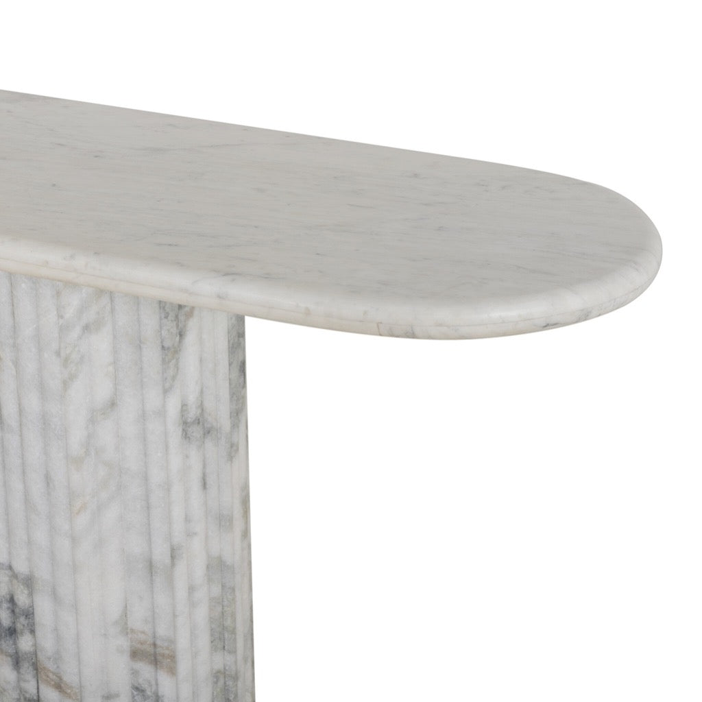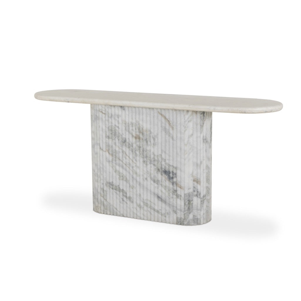 Italian-inspired for effortless sophistication. A swirling marble base is scalloped for a linear look with heavy texture, finished with a pill-shaped top for extra entryway styling atop this console table.