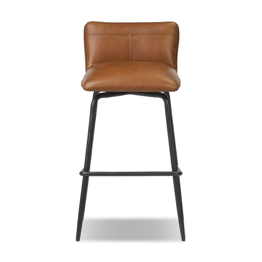 Modern seating at the counter with the comfort of exclusive top-grain leather. Built from hammered iron in a low profile, the swivel stool has a thick seat cushion and back with stitched design detailing.