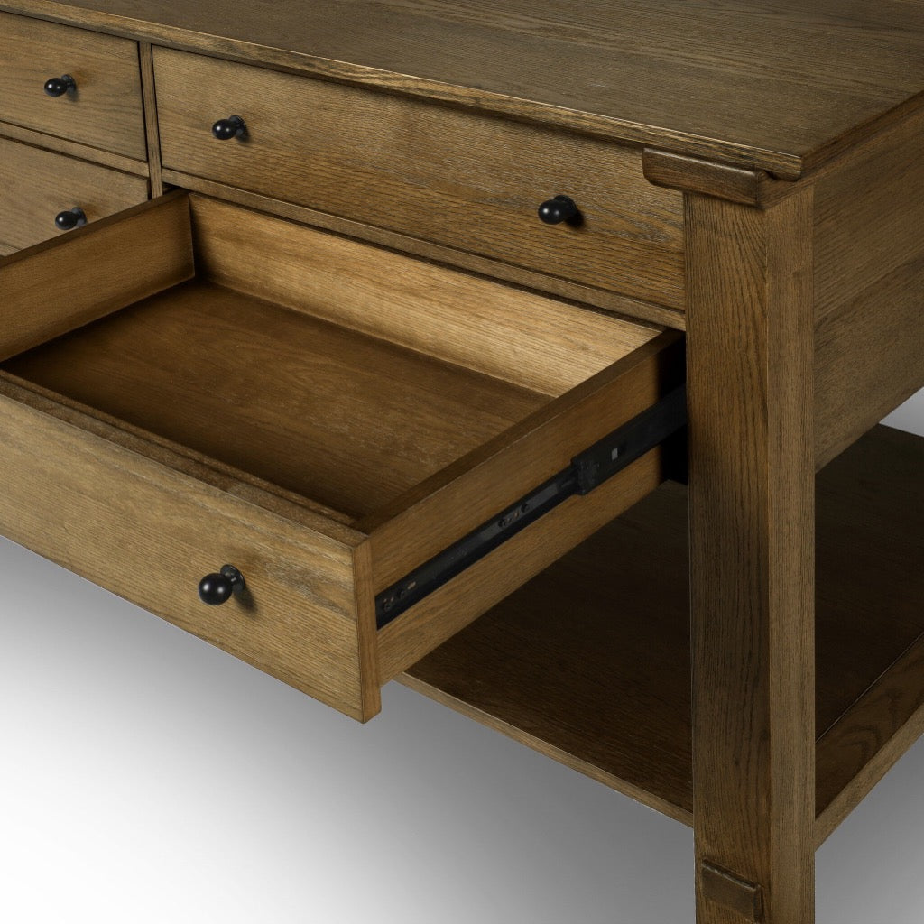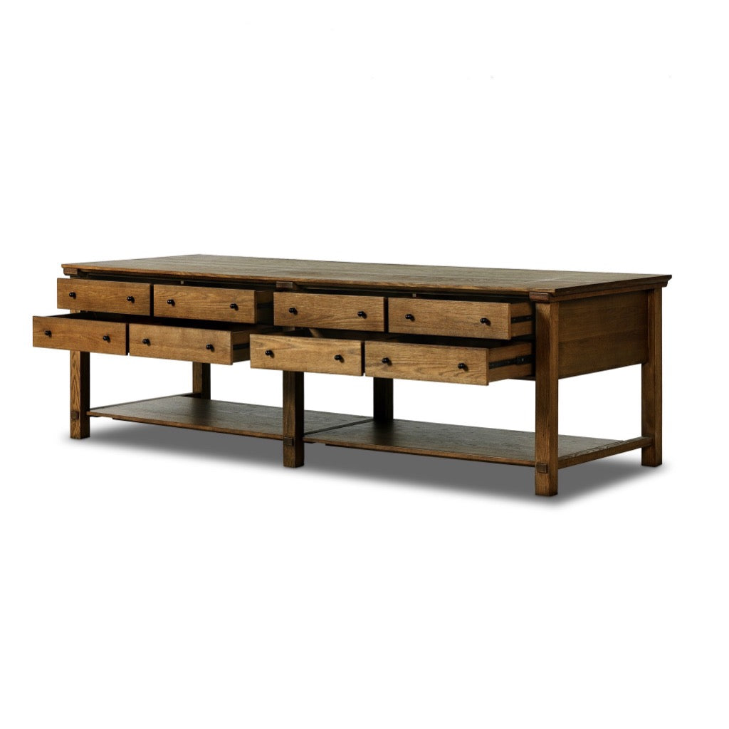 Make room for more prepping, gathering and storage. This large and functional kitchen island features eight wide drawers on one side, a large bottom shelf below and room for stools. Designed with an oak cradle frame that holds the tabletop above with exposed joint details on the shelf and legs below for a benchmade look and feel. Crafted from oak with iron accents.