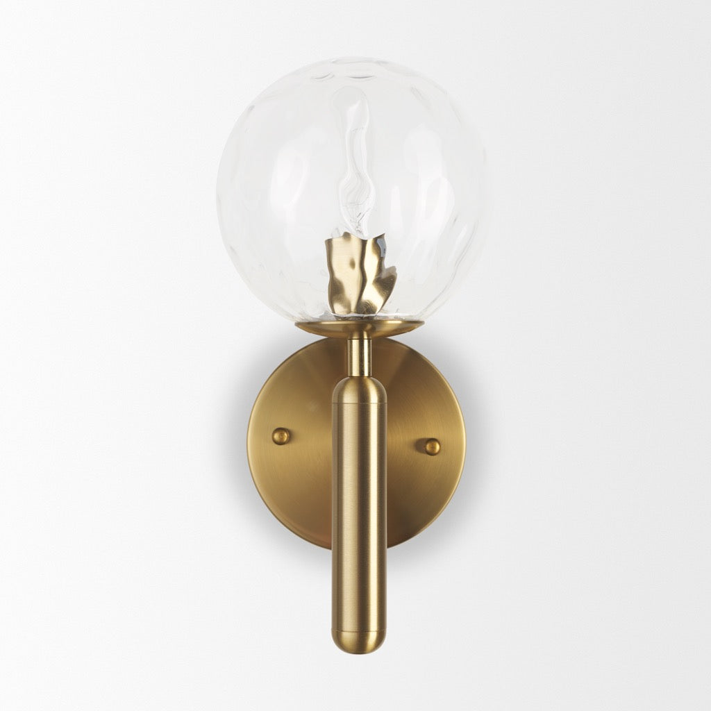 The Britton Wall Sconce is a 1-light fixture made of an electroplated gold finished metal with a clear water glass textured glass globe.