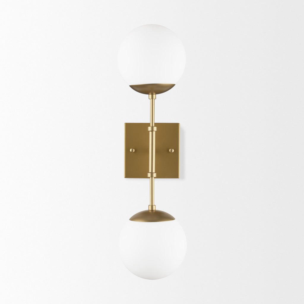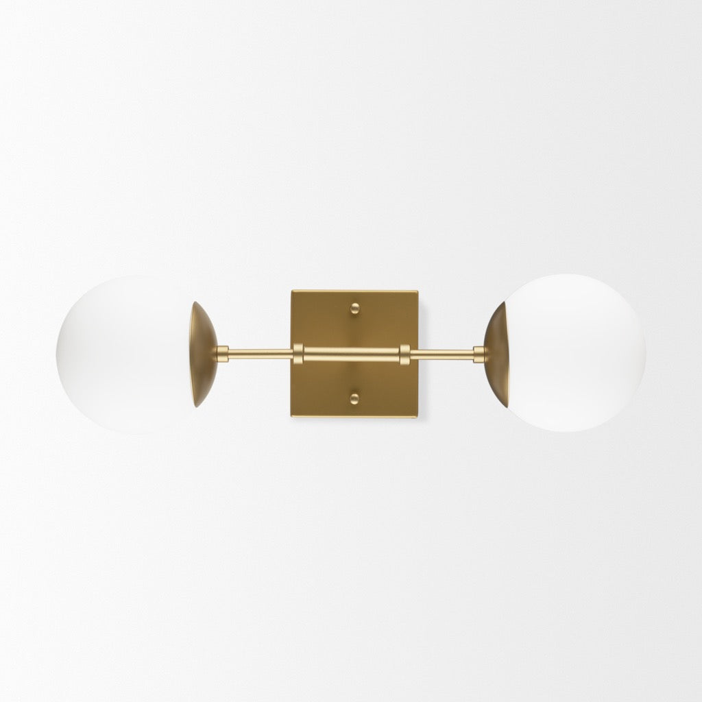 The Edie is a gold-finished iron metal wall sconce with two frosted glass globes.