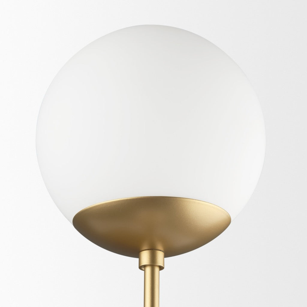 - Materials: Brushed brass finished metal and opaque, frosted glass globes.