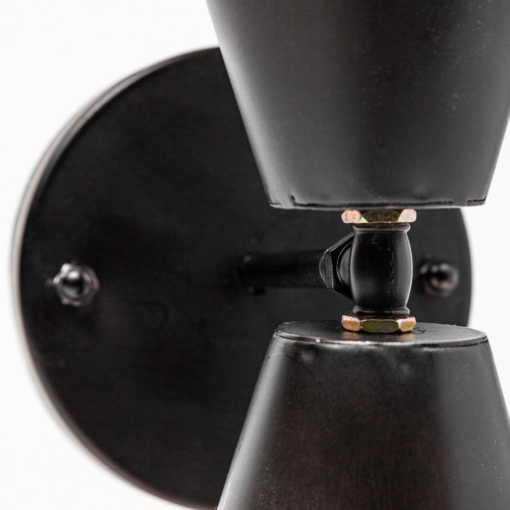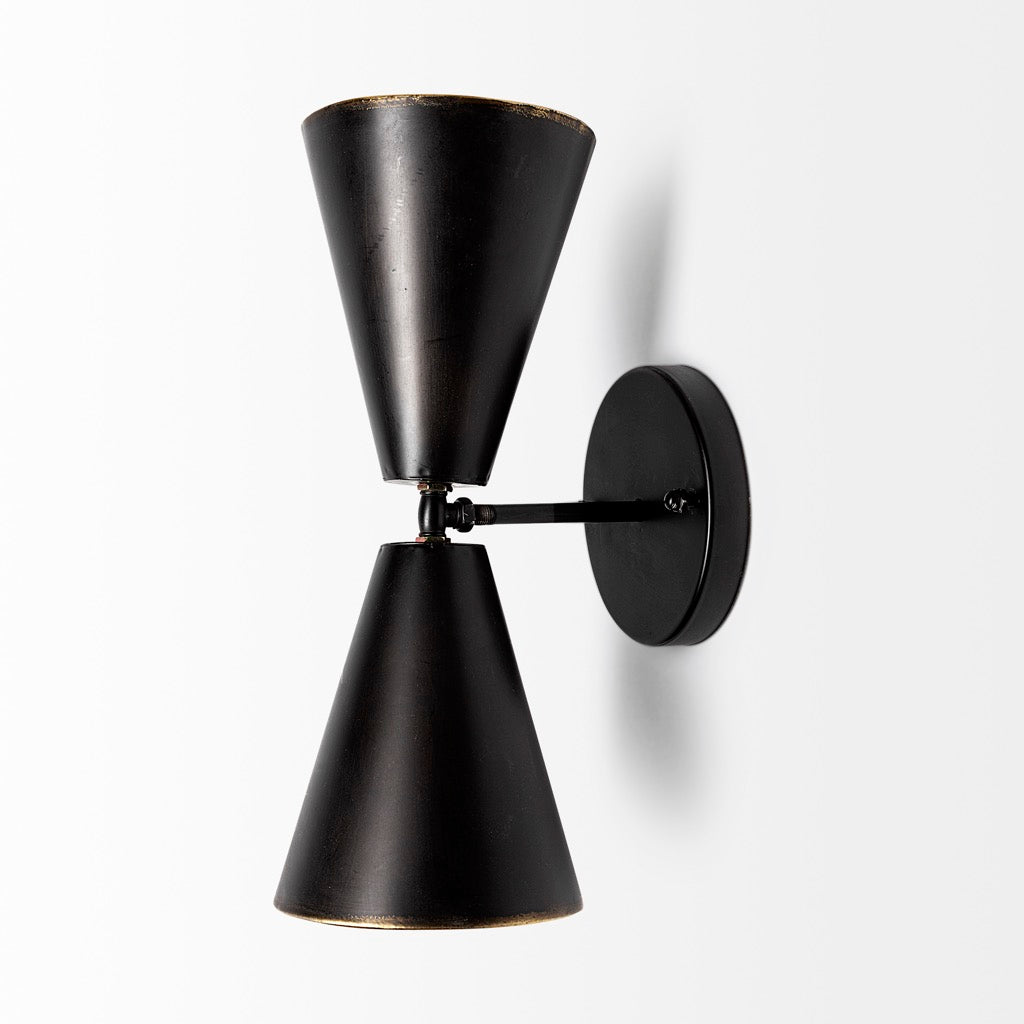 The Eris is a stylish metal wall sconce featuring a double-cone lampshade with two lights that can be mounted vertically or horizontally.
