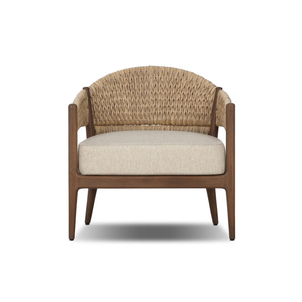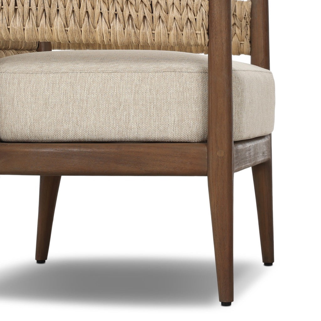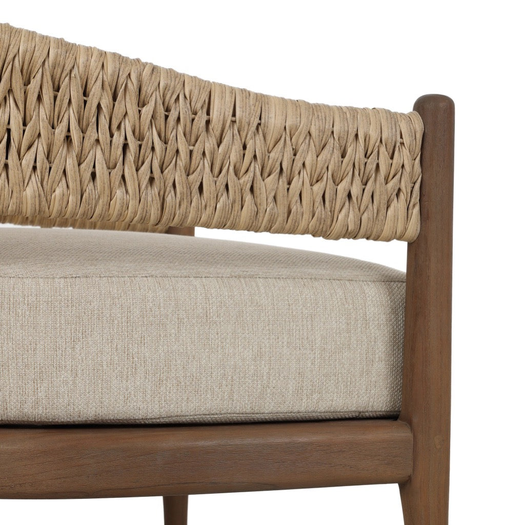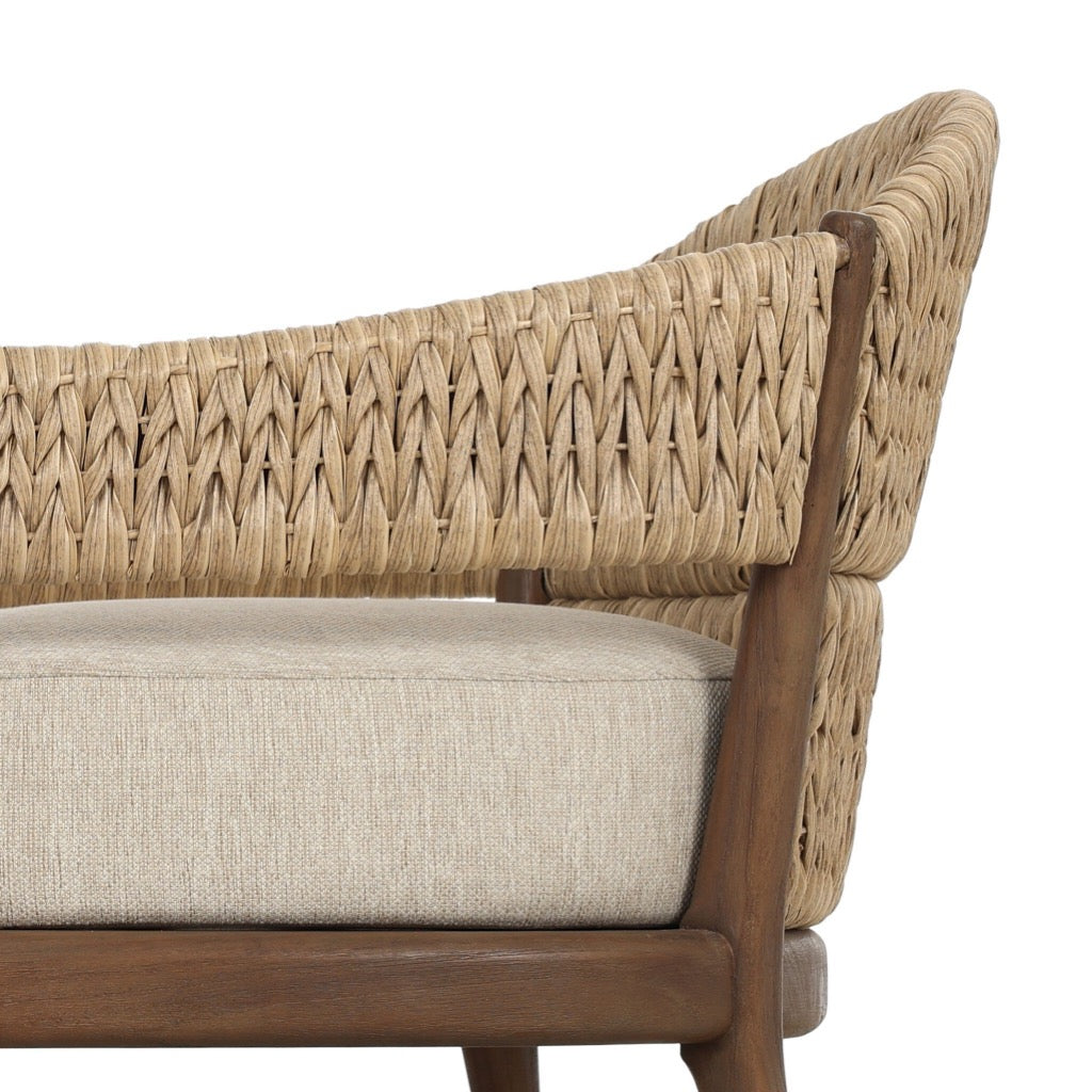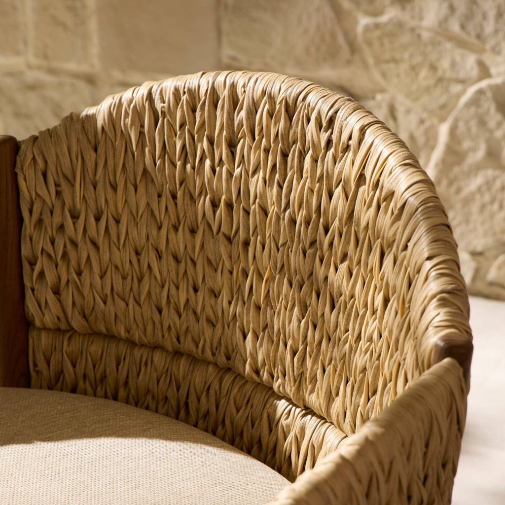 A fresh take on the traditional woven style, this outdoor chair features a faux banana leaf material wrapped in a bold, chunky texture around FSC®-certified teak framing. Cover or store indoors during inclement weather and when not in use.