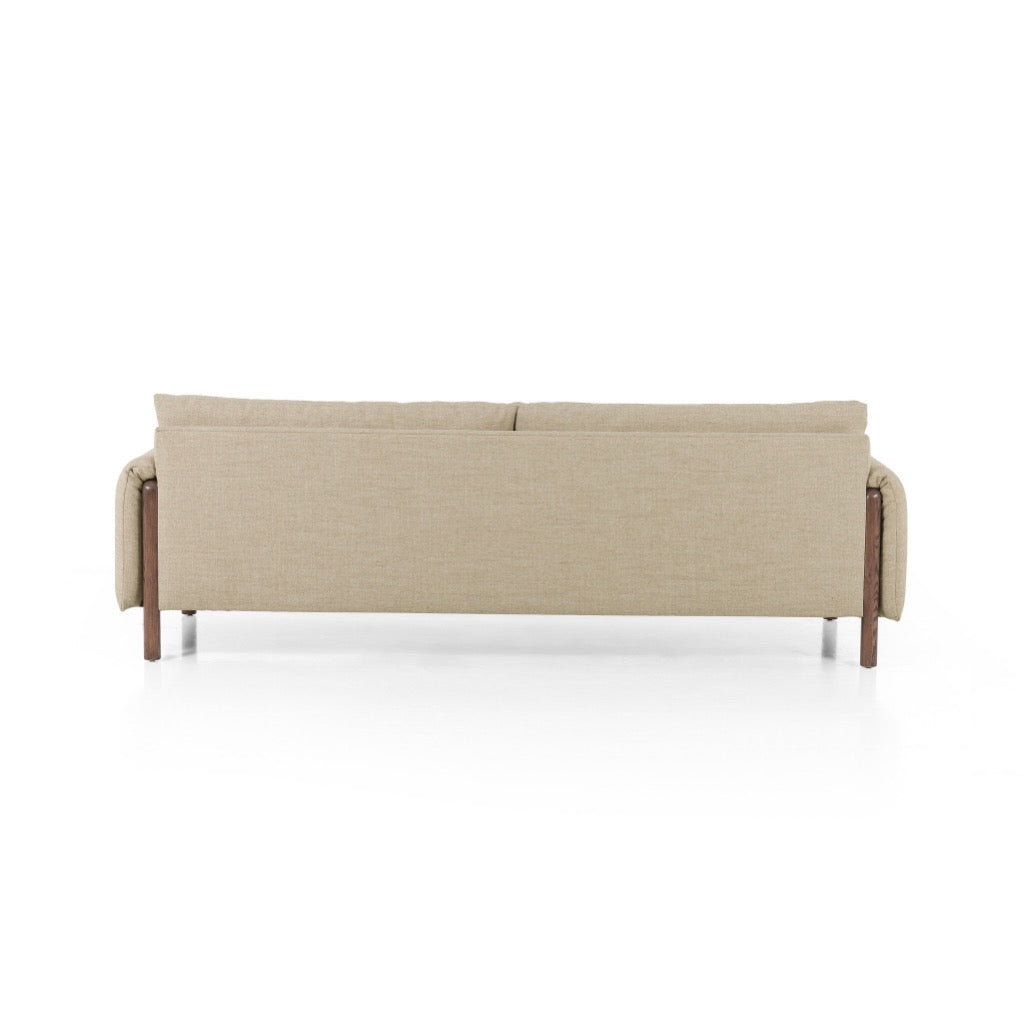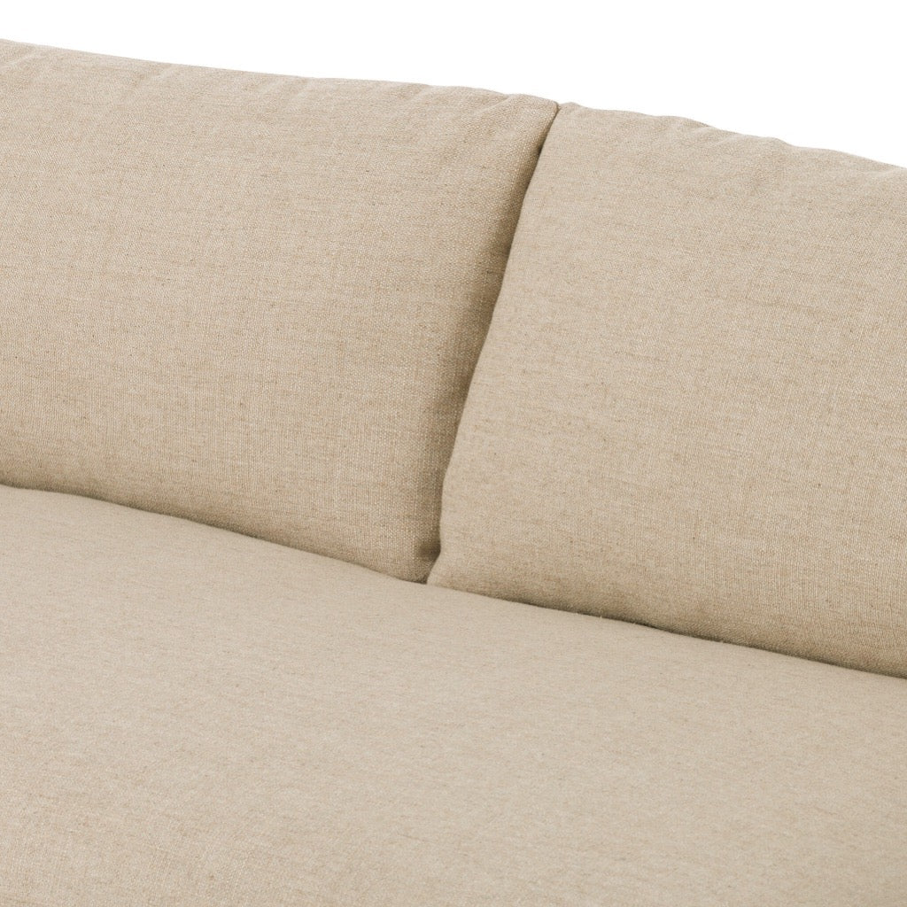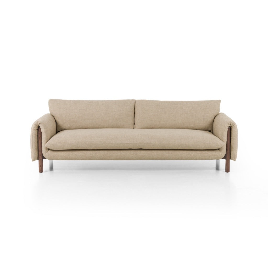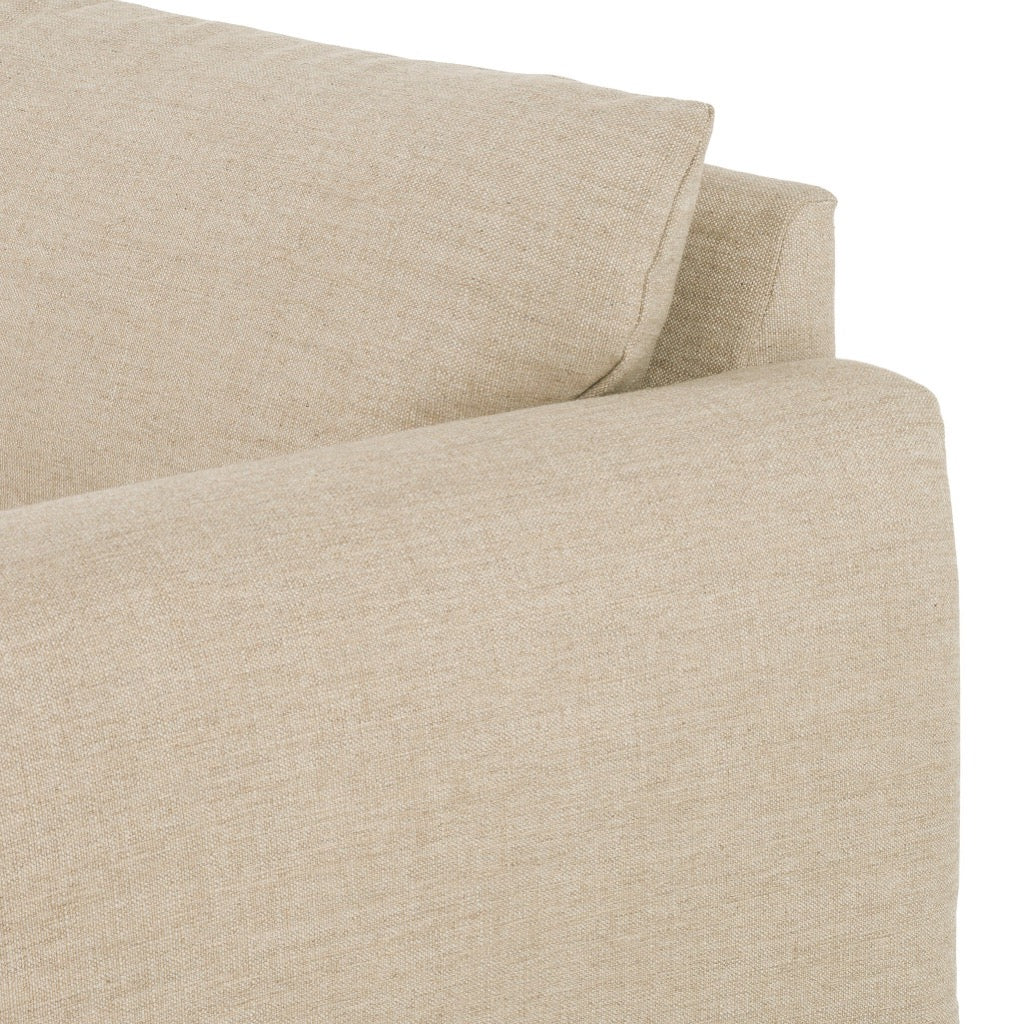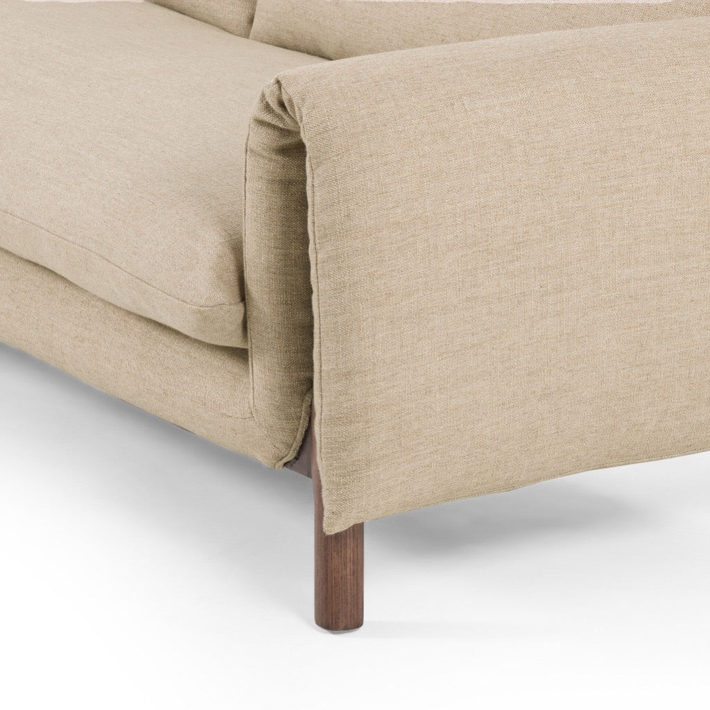 Coastal casual meets the folded trend. Wide folded wrap arms and slim wooden legs bring sleek drama to a traditional frame. Upholstered in a soft poly/linen blend with soft, subtle texture for a casual look and feel.