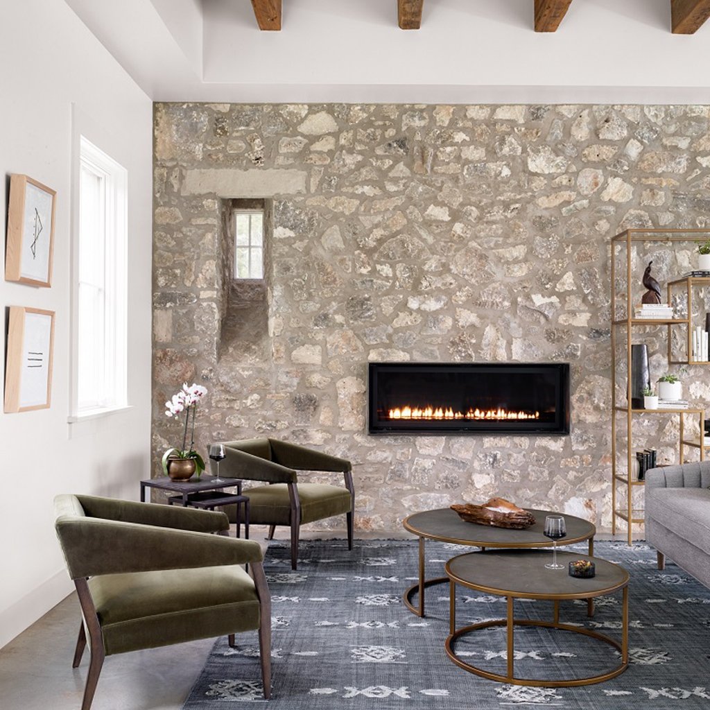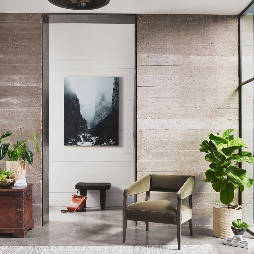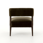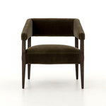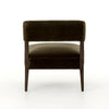 Material and shape share the spotlight. A burnt oak frame meshes seamlessly with olive green upholstery for a look of velvety glam. Angular arms nod the best of mid-century design.