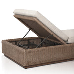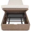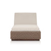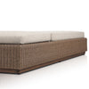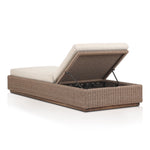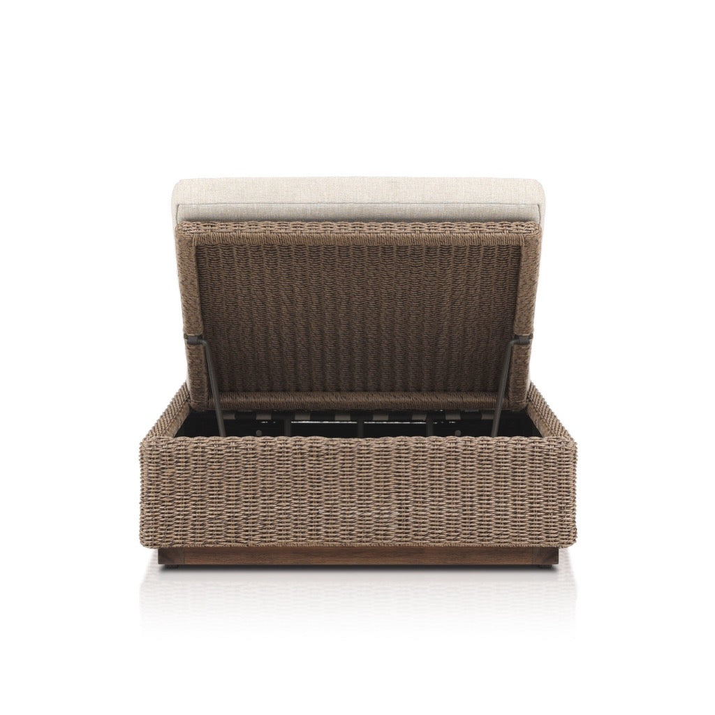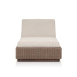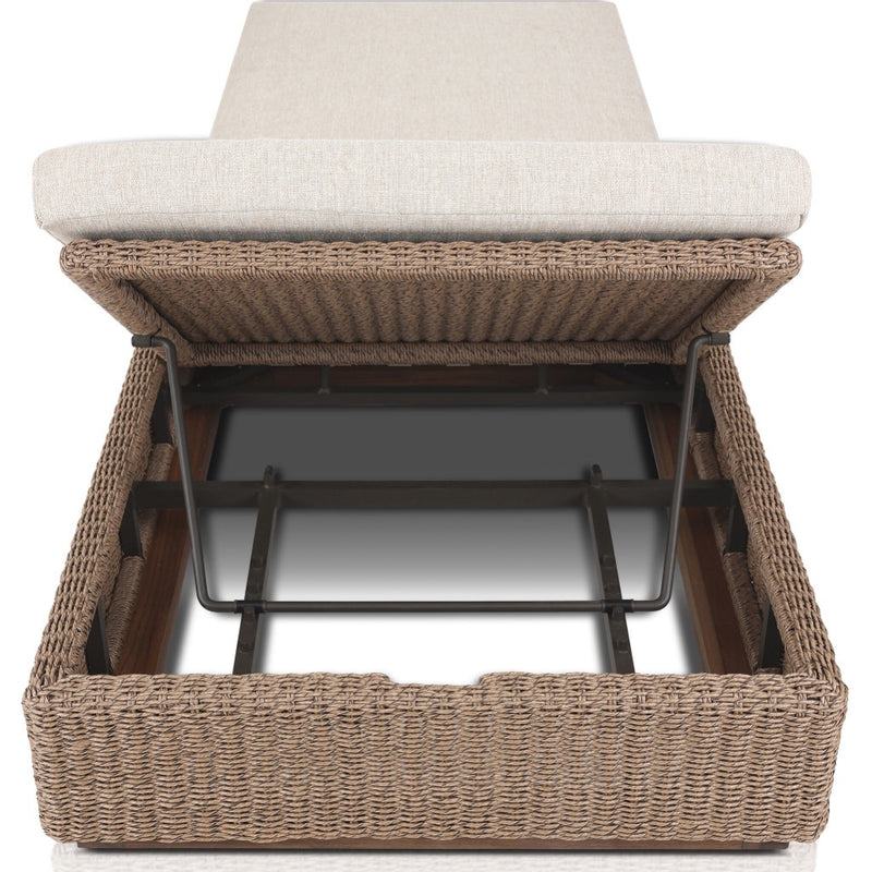 A slim, stylish profile invites outdoor lounging. The woven box base frames durable, outdoor-friendly cushioning in soft buff. An adjustable back offers personalized comfort, while the wooden plinth elevates the sleek design. Cover or store indoors during inclement weather and when not in use.
