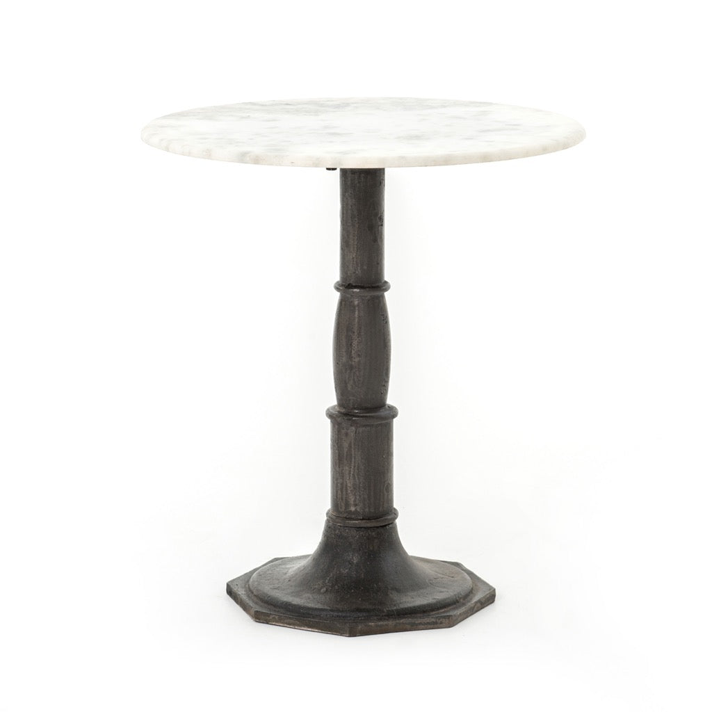 Style on the side. French industrial inspiration pairs an elegant, white marble top with a carbon-washed, distressed iron base.