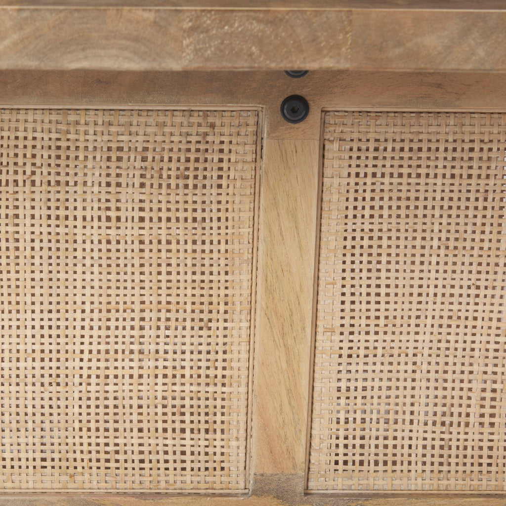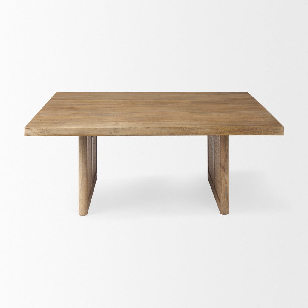 The Grier Coffee Table is made of solid, light brown mango wood with the two cane panels that can be seen on the sides of the table.