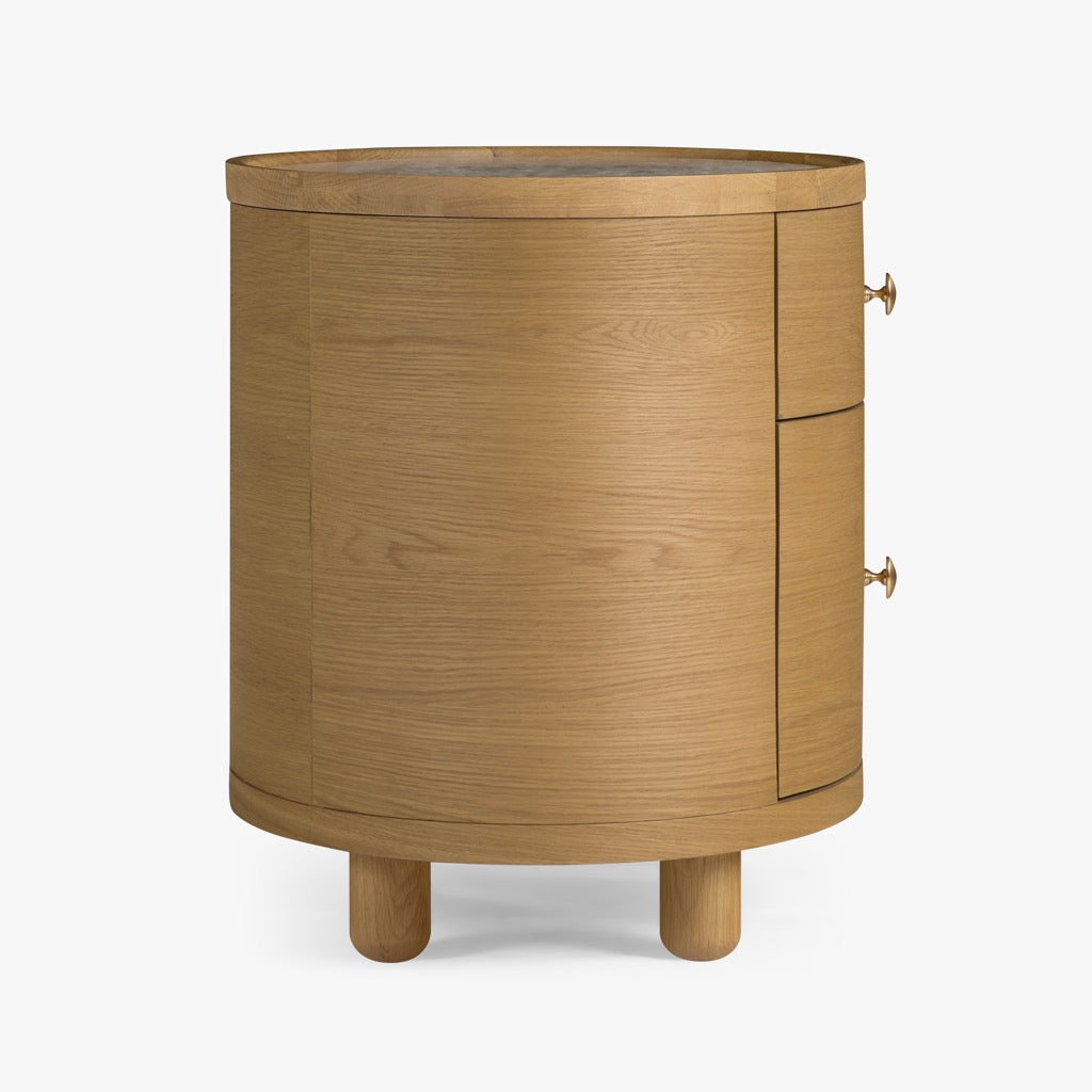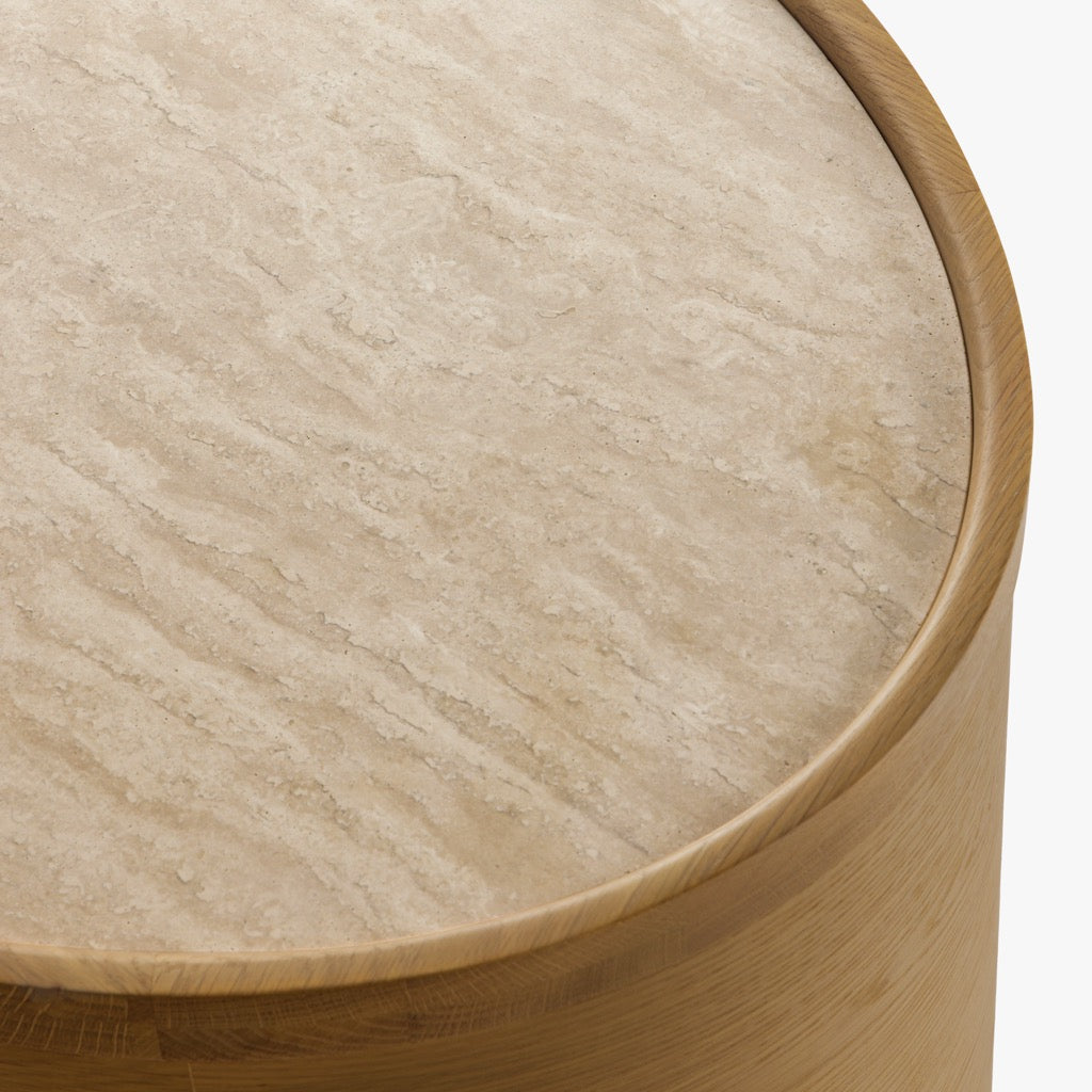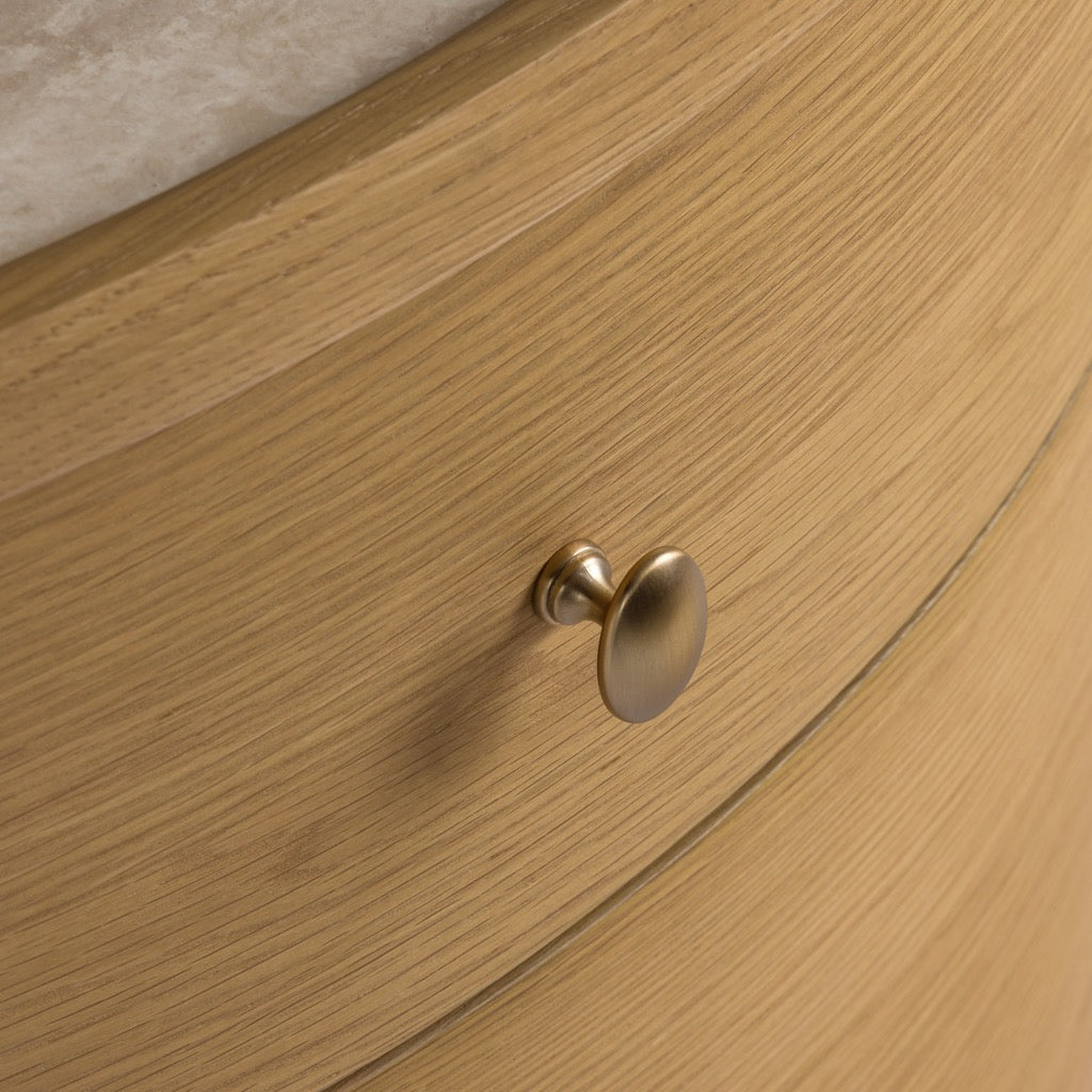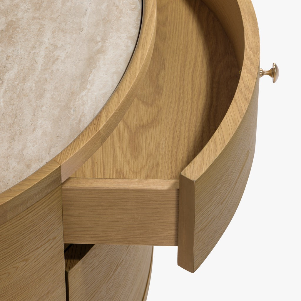 The Laguna end table has a refined, oval shape, and is crafted from solid oak and oak veneers, paired with a travertine top and antique bronze finish hardware. The bun feet add a playful accent to the design. Available in either a light oak or a walnut finish, the Laguna table is perfect for use in a living room, or as a pair of nightstands in a bedroom.