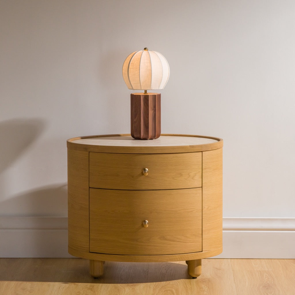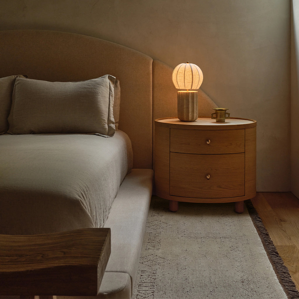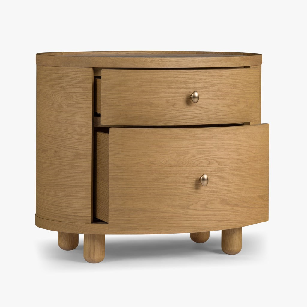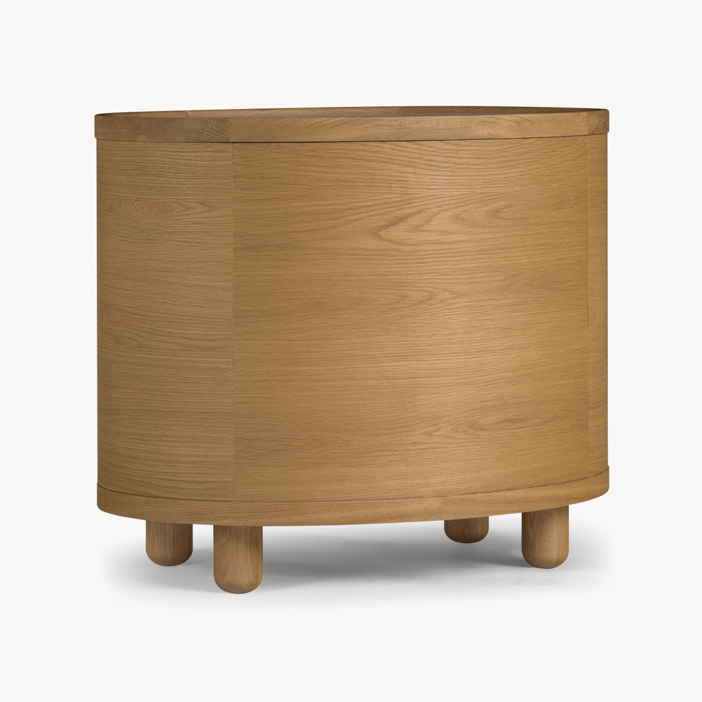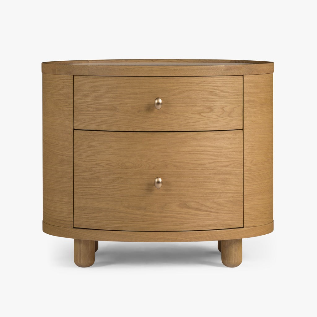 The Laguna end table has a refined, oval shape, and is crafted from solid oak and oak veneers, paired with a travertine top and antique bronze finish hardware. The bun feet add a playful accent to the design. Available in either a light oak or a walnut finish, the Laguna table is perfect for use in a living room, or as a pair of nightstands in a bedroom.