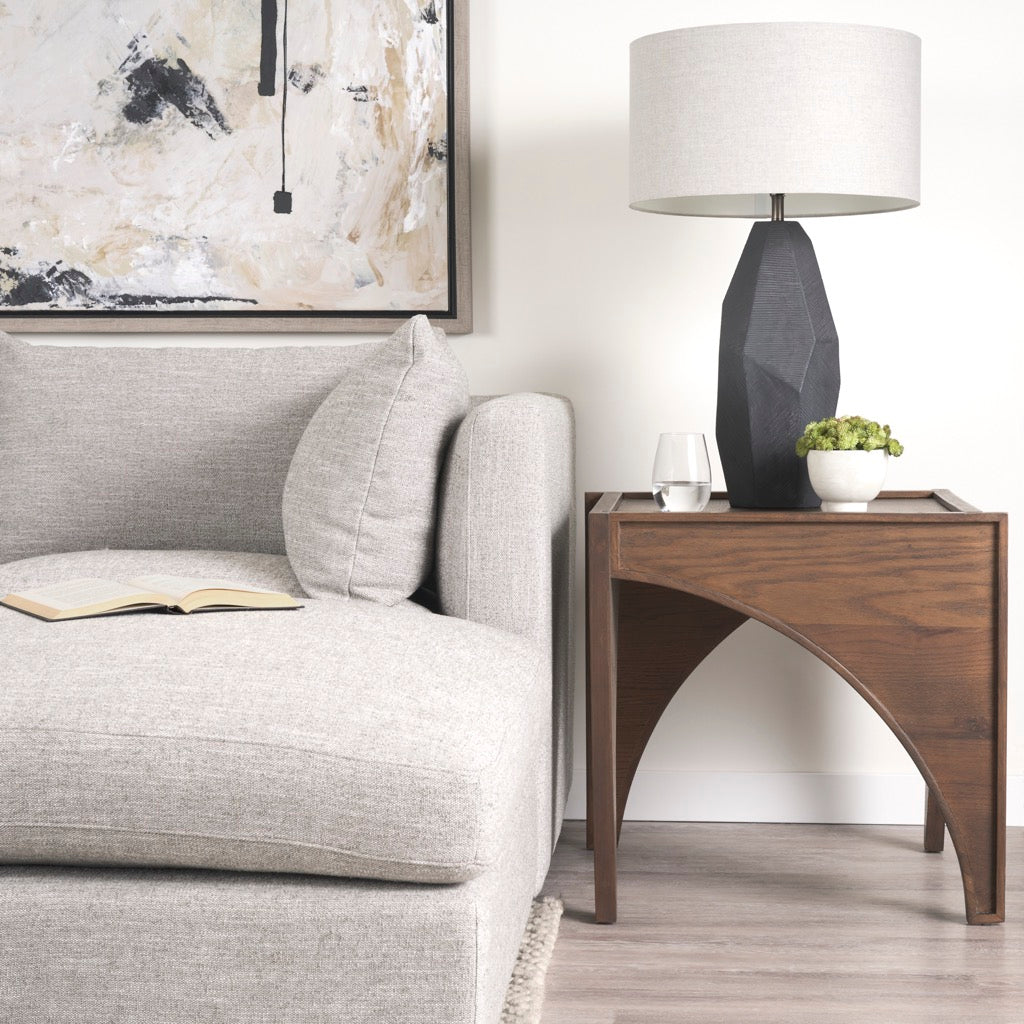 The Laraya End Table is crafted from solid oak and engineered wood with a smooth finish and rich dark brown stain.
