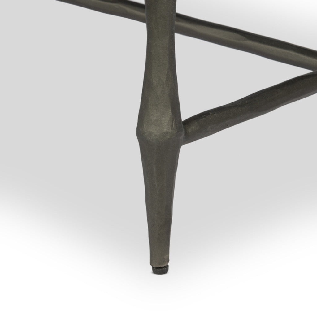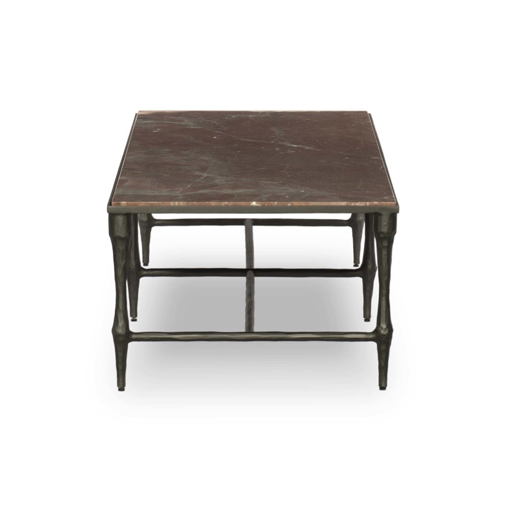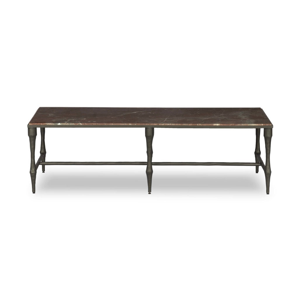Hammered iron and rust-colored marble come together in this mixed material, heritage-inspired coffee table, with simplified turned legs and stretcher detailing.