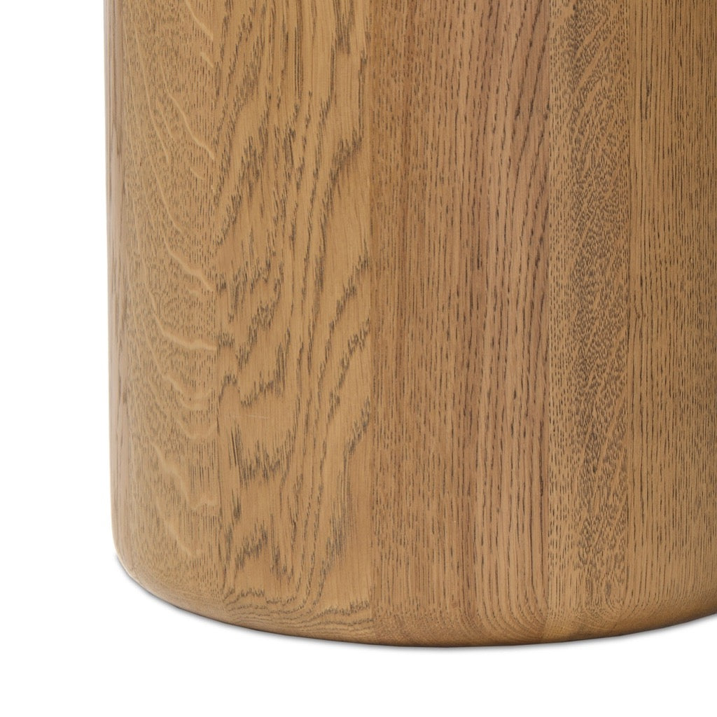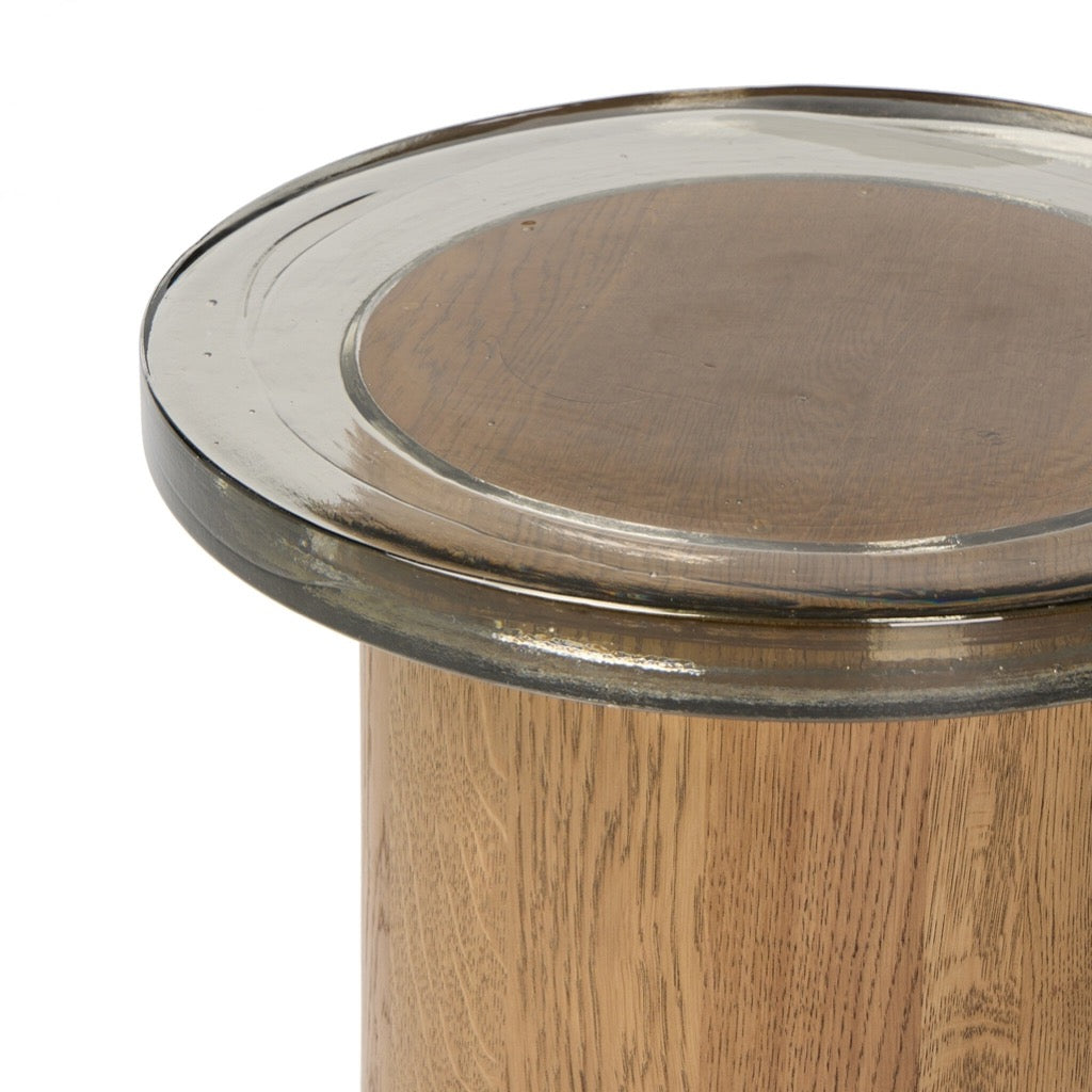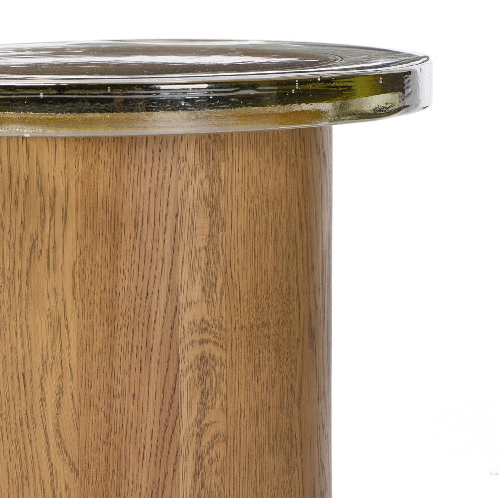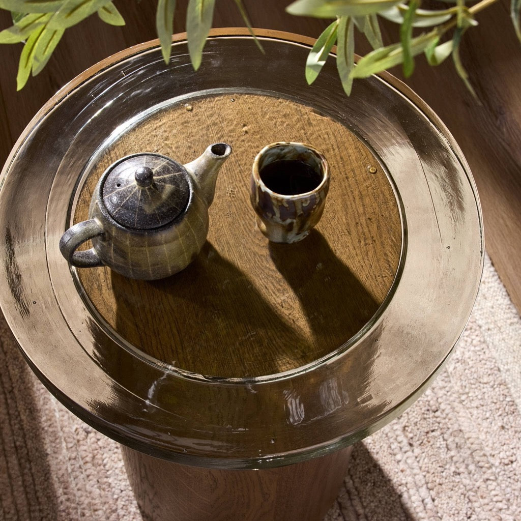 A round cast glass top settles seamlessly on a boldly scaled pedestal base, balancing contrast in material and finish. Pair with the coffee table for a nesting duo.