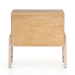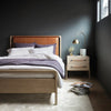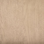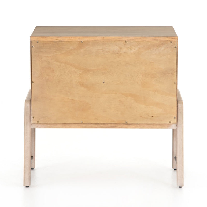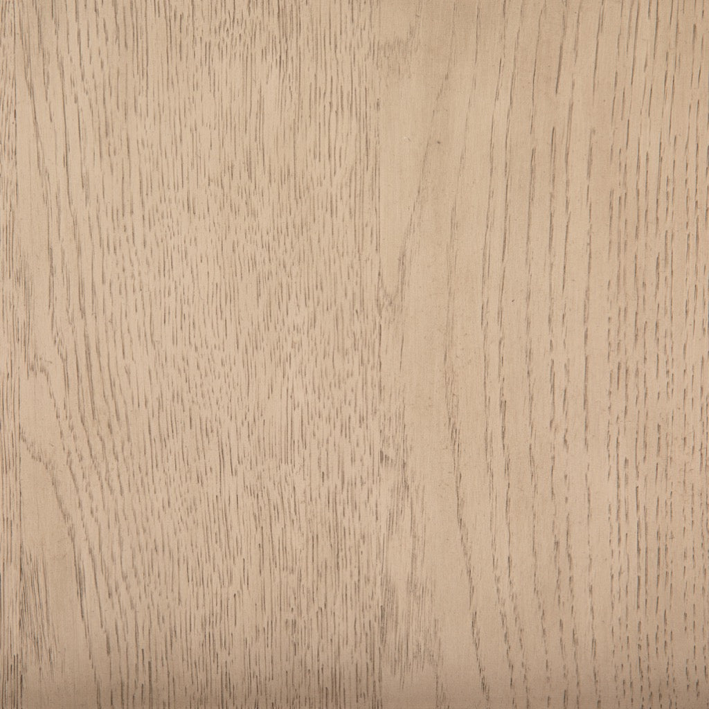 Light-finished oak forms a clean silhouette for dual drawers with iron hardware wrapped in tan top-grain leather.