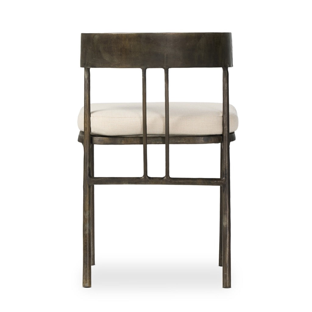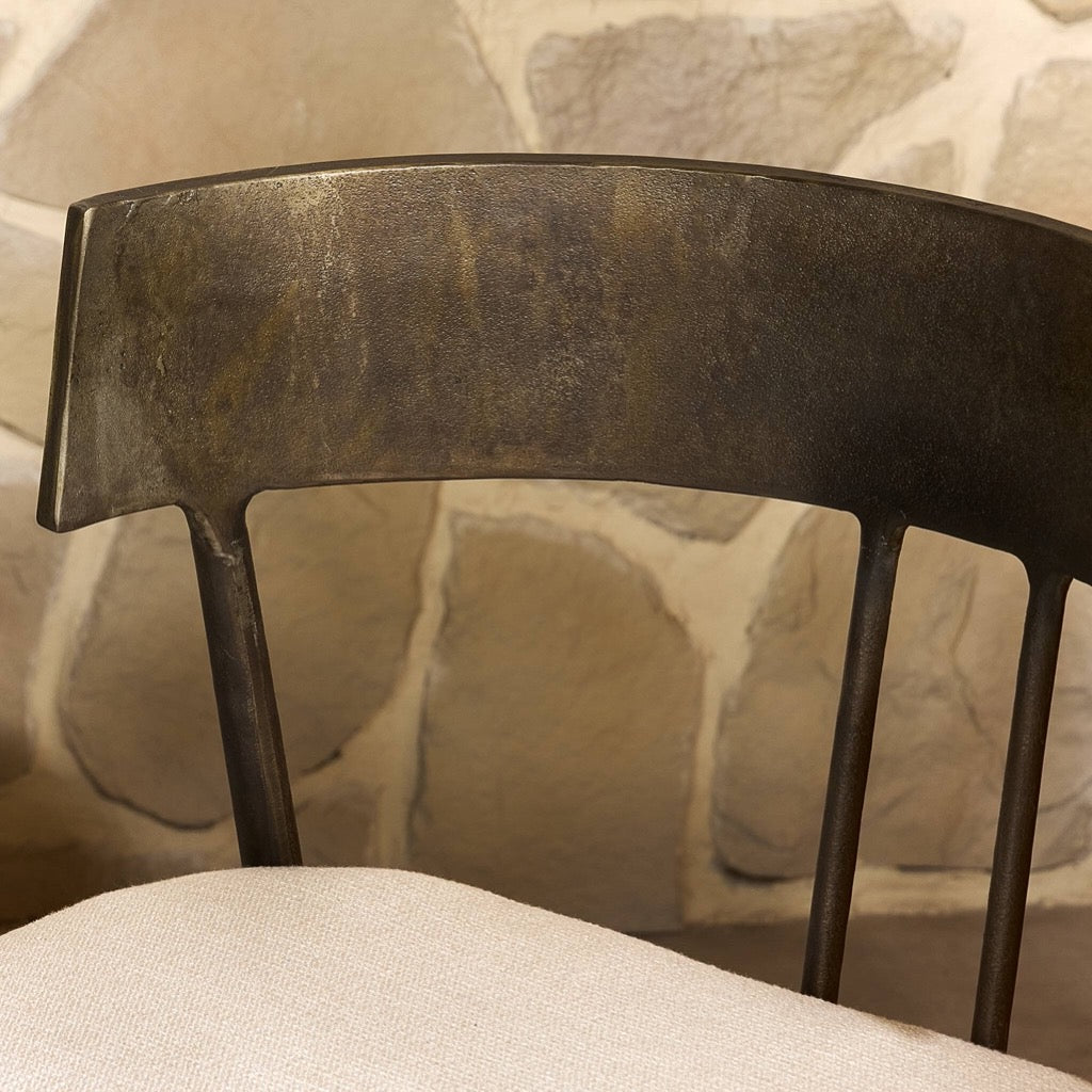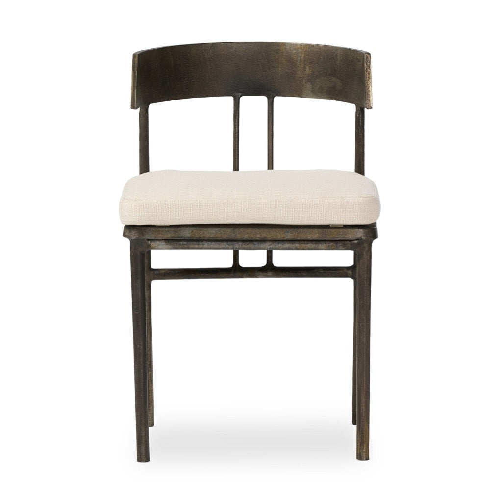 Traditional shaping, reimagined. The classic yolk seat back and simple framing of this outdoor dining chair balances the weight of the cast aluminum frame. A linen-like seat cushion brings softness and comfort. Cover or store inside during inclement weather and when not in use.
