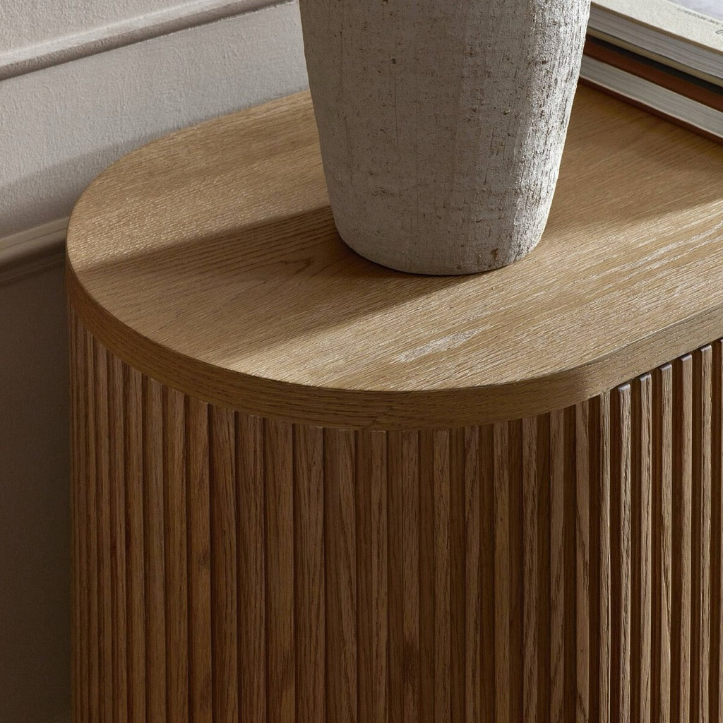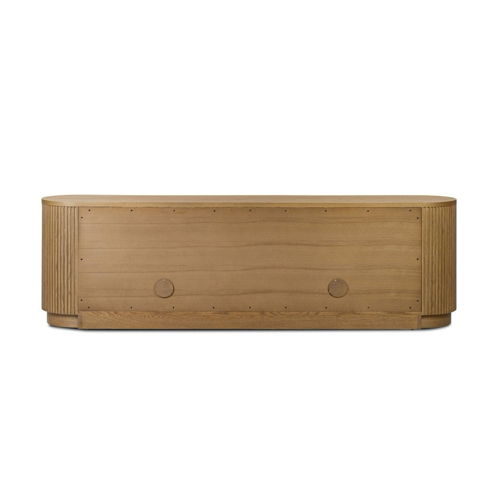 Crafted from desert oak solids and veneers with a plinth-style base, rounded sides and linear reeding, this sideboard exudes midcentury vibes. Fully finished interior and shelves for quality detailing inside and out.