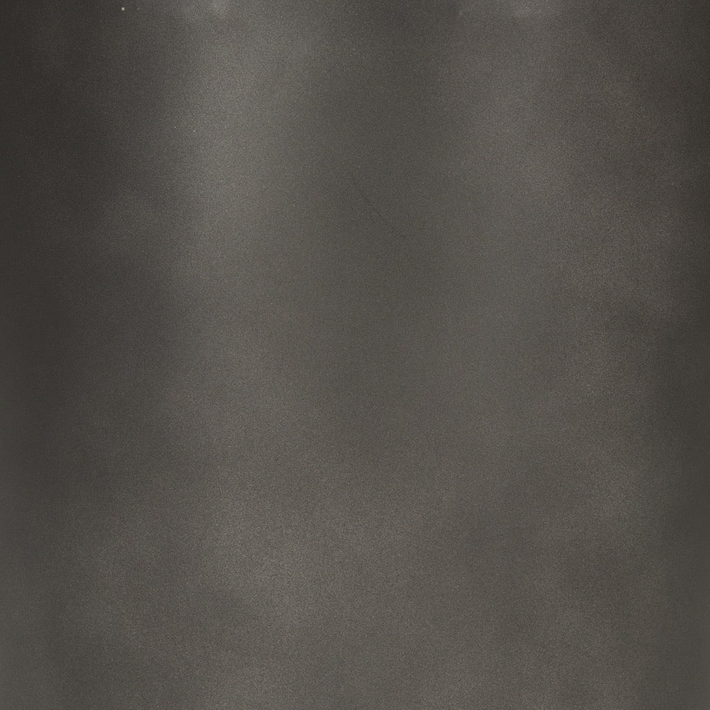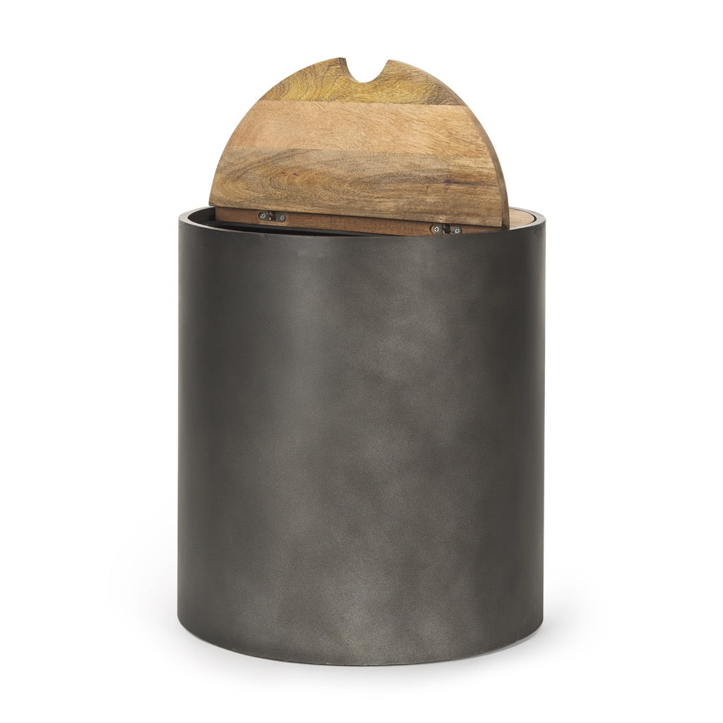 Eclipse is a bold, cylindrical side table with a painted gunmetal gray body and brown wood tops.