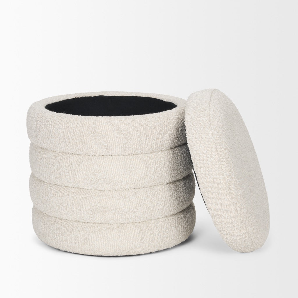 Elise Ottoman is round, upholstered in a cream boucle fabric with hidden storage.