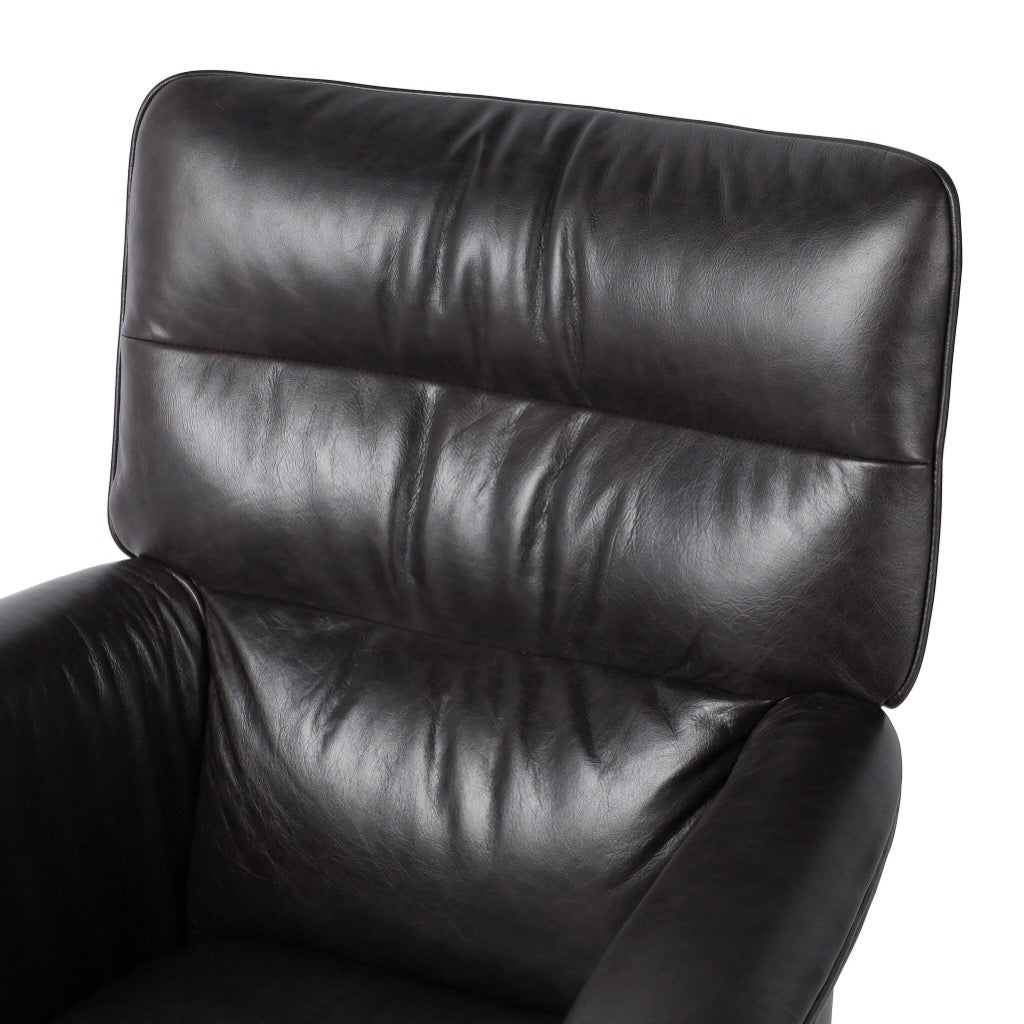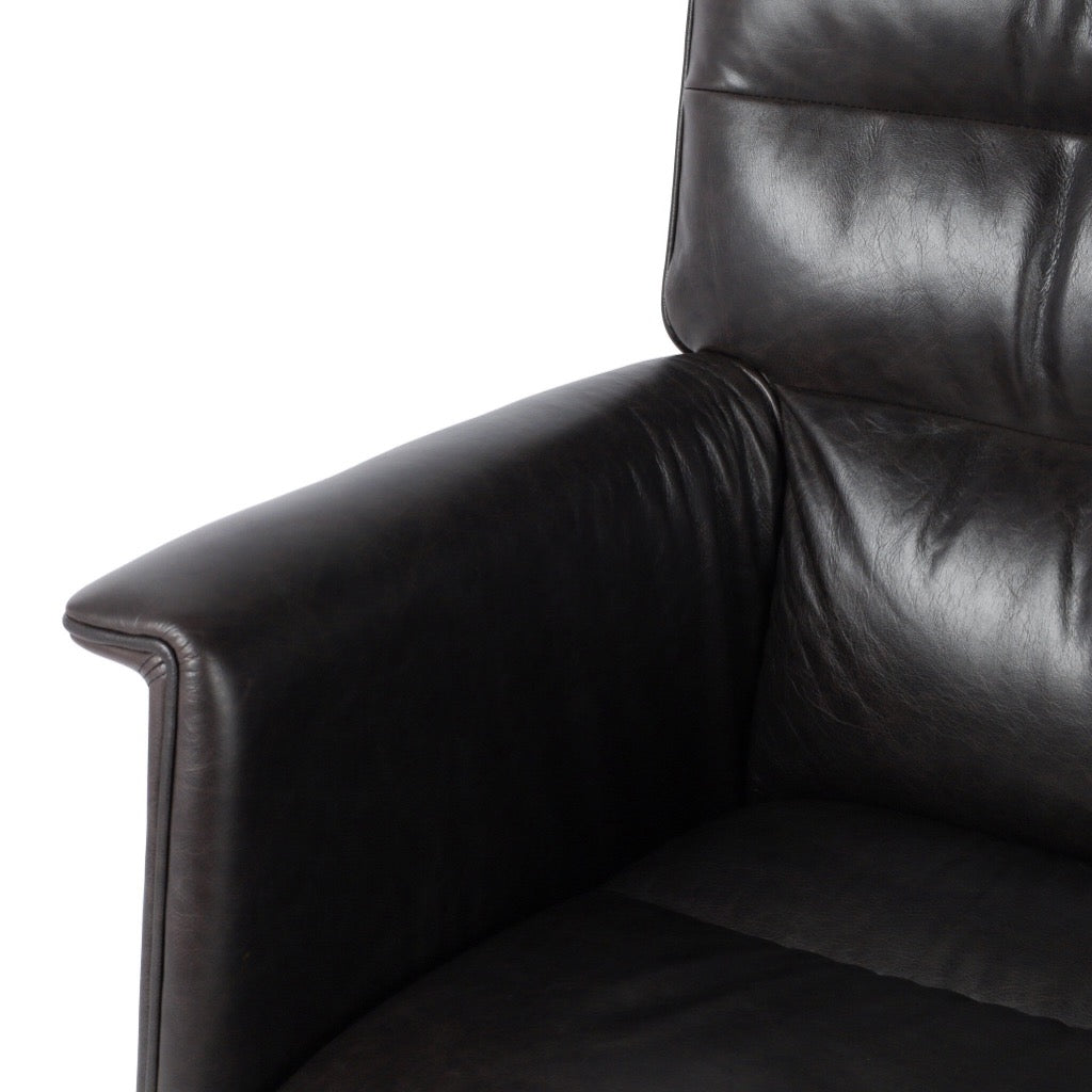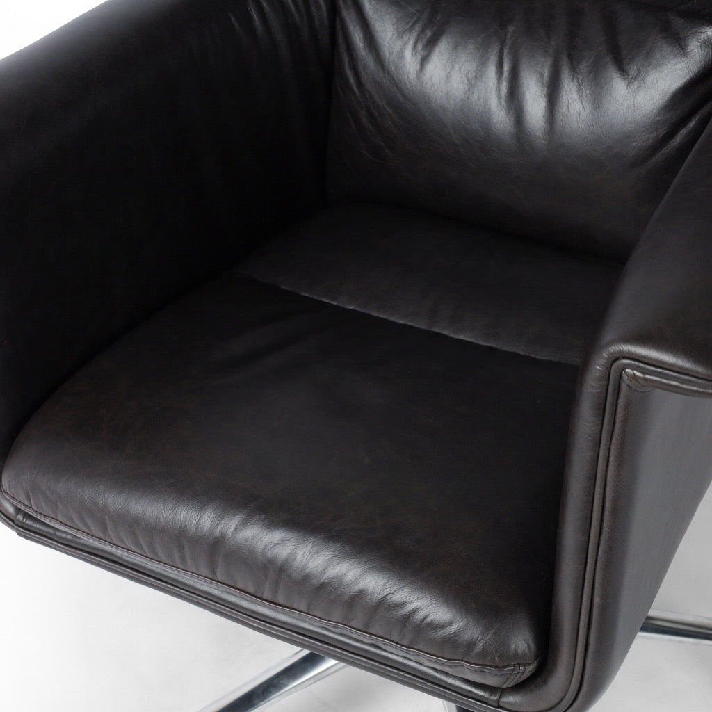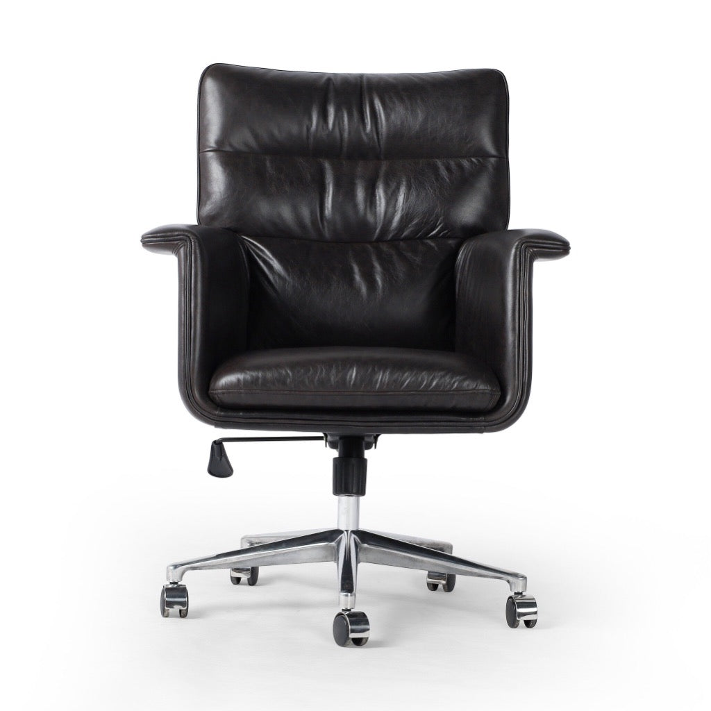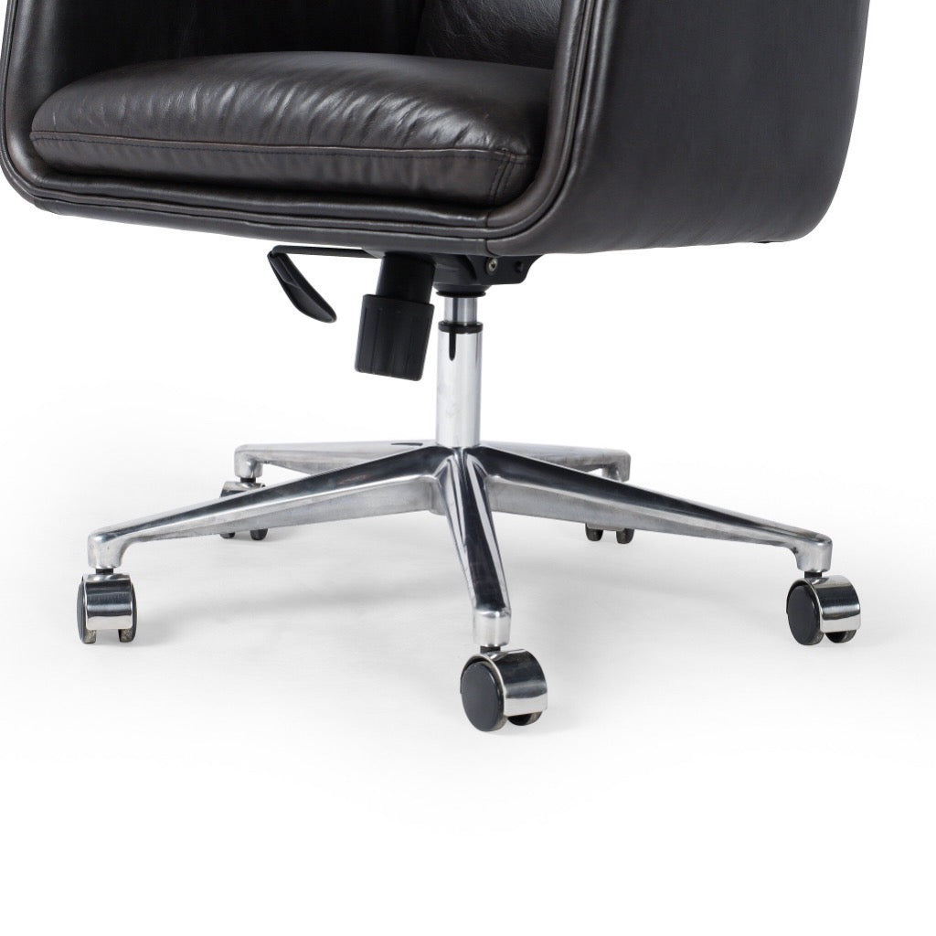 Black top-grain leather and polished aluminum fuse in this modern office chair perfectly sized for executive desks. Casters plus height adjustability add ease.