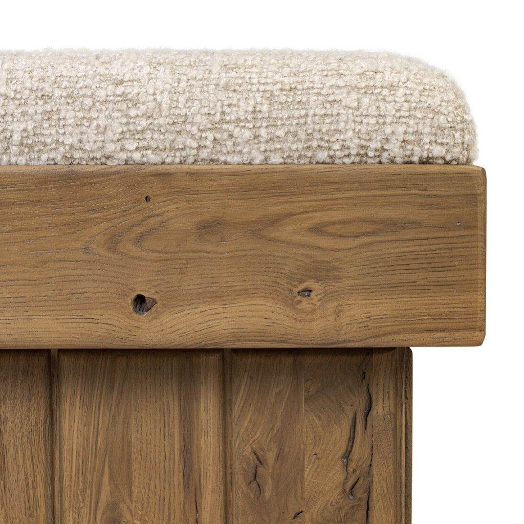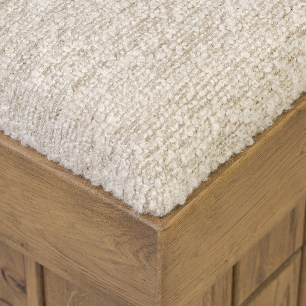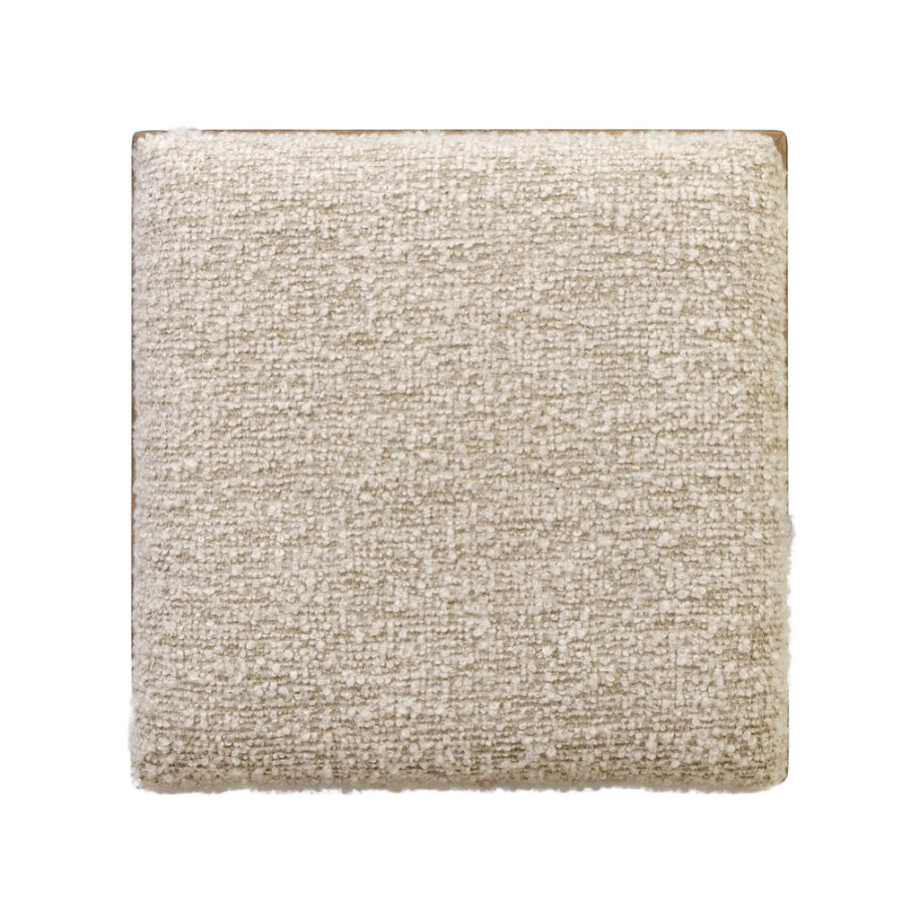 This square accent stool features an exaggerated plinth base, paneled on all sides for added dimension. With a thick apron and inflated seat, the character-rich oak veneer plays with scale and texture from the boucle-style upholstery to the base.