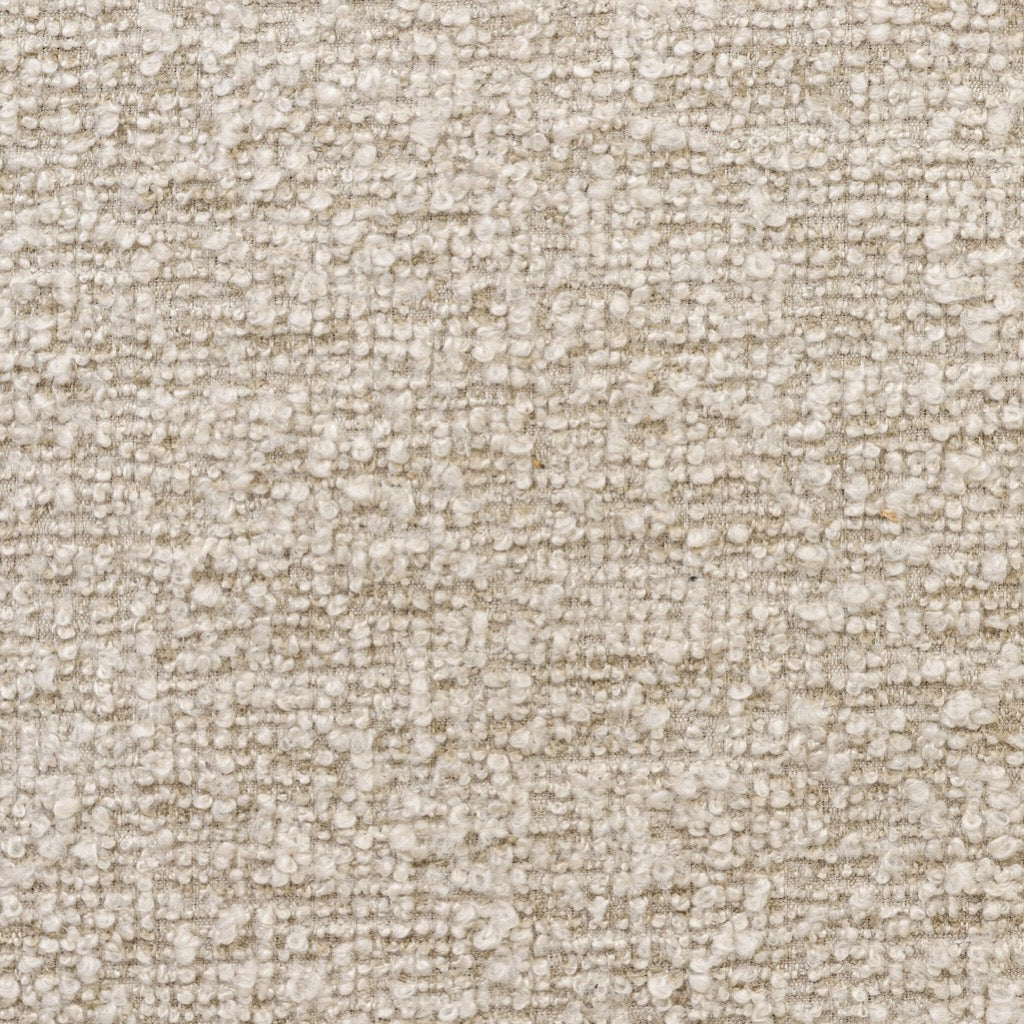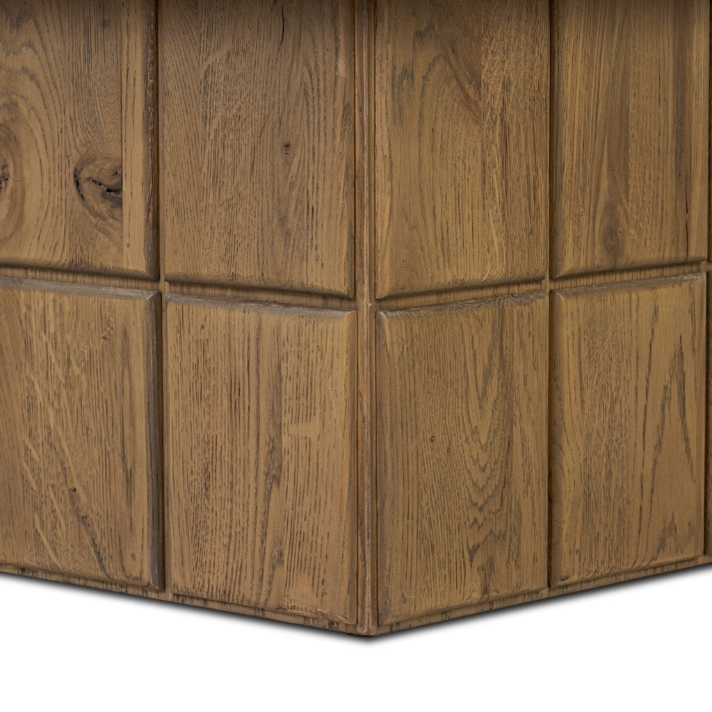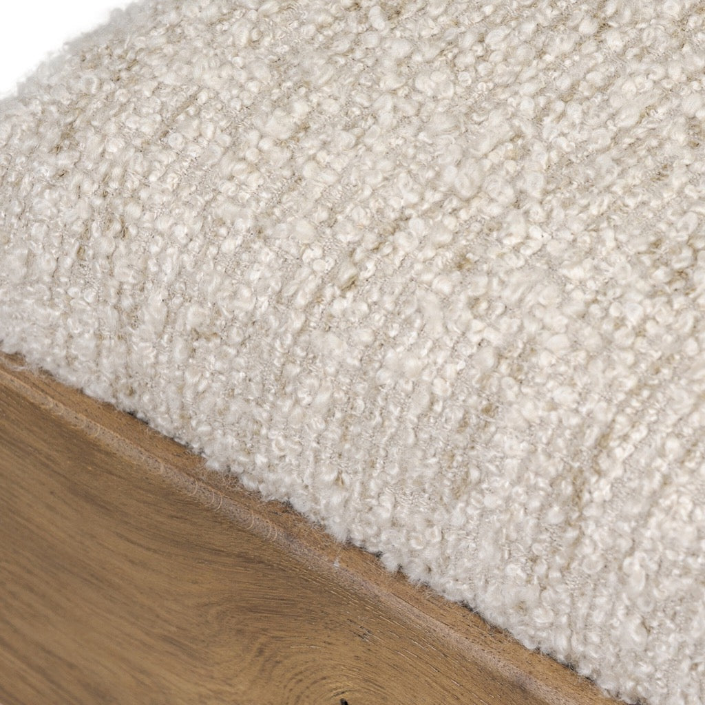 This square accent stool features an exaggerated plinth base, paneled on all sides for added dimension. With a thick apron and inflated seat, the character-rich oak veneer plays with scale and texture from the boucle-style upholstery to the base.