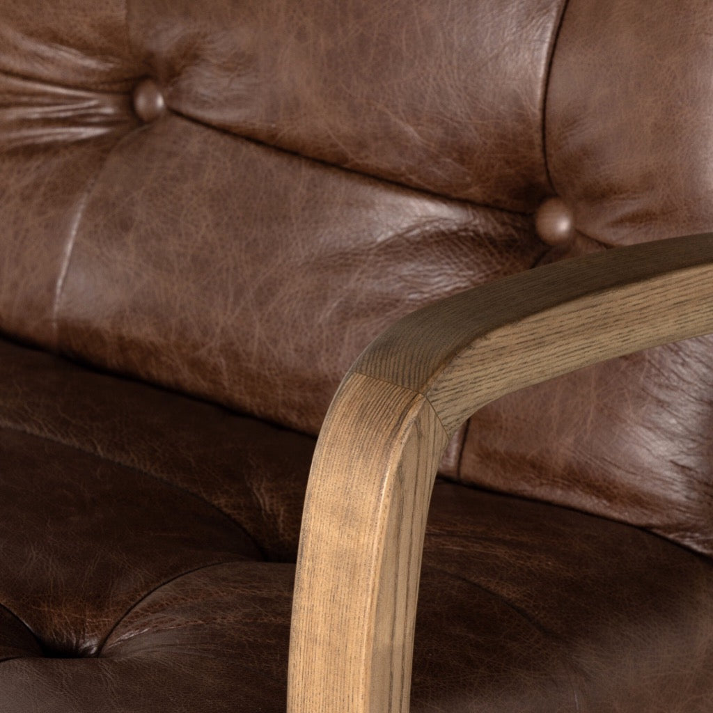 Heavy tufting delivers comfort to a fluid-shaped desk chair made from cocoa-colored top-grain leather. Ash arms complement a polished aluminum base, with seat heigh adjustability for ease in the modern office.