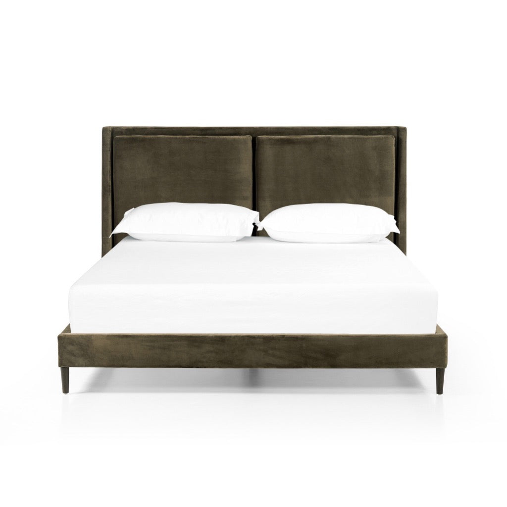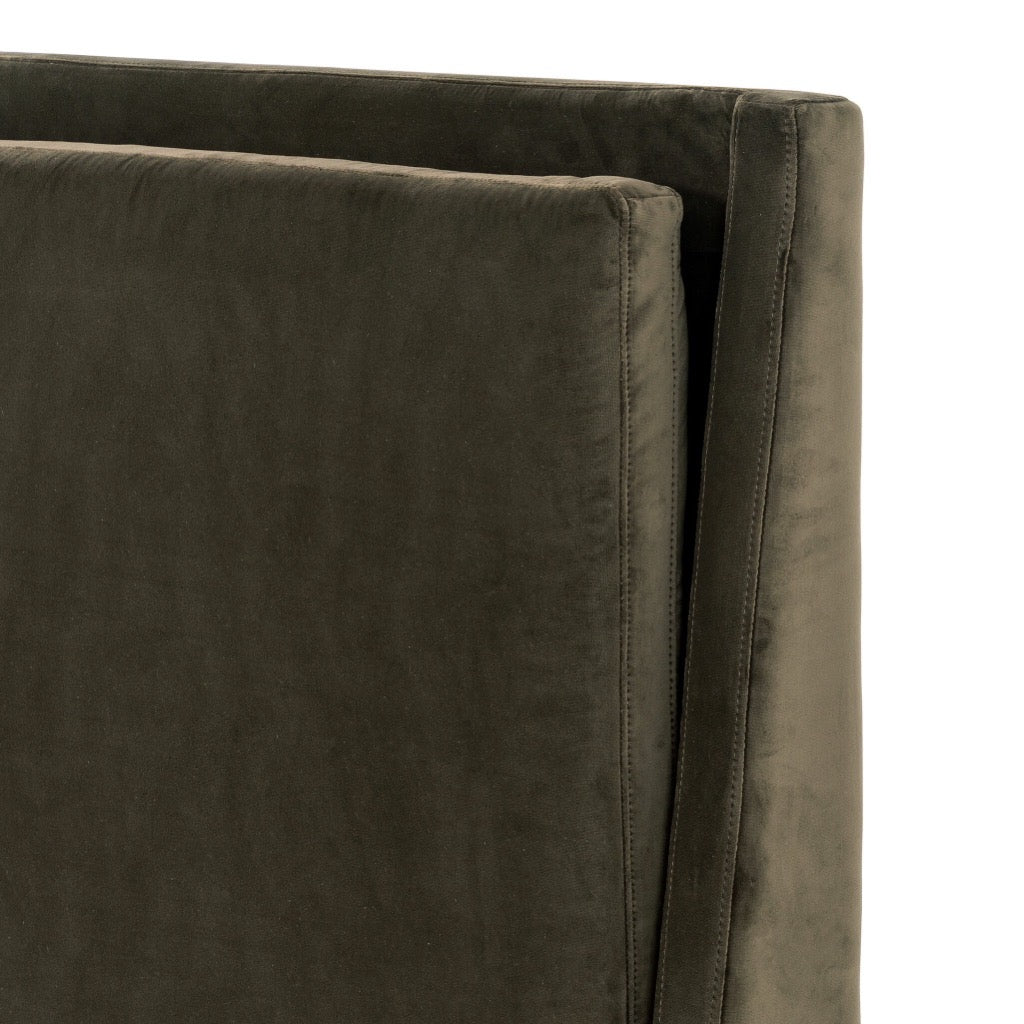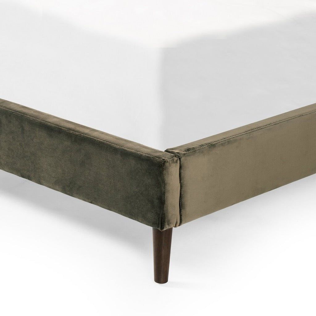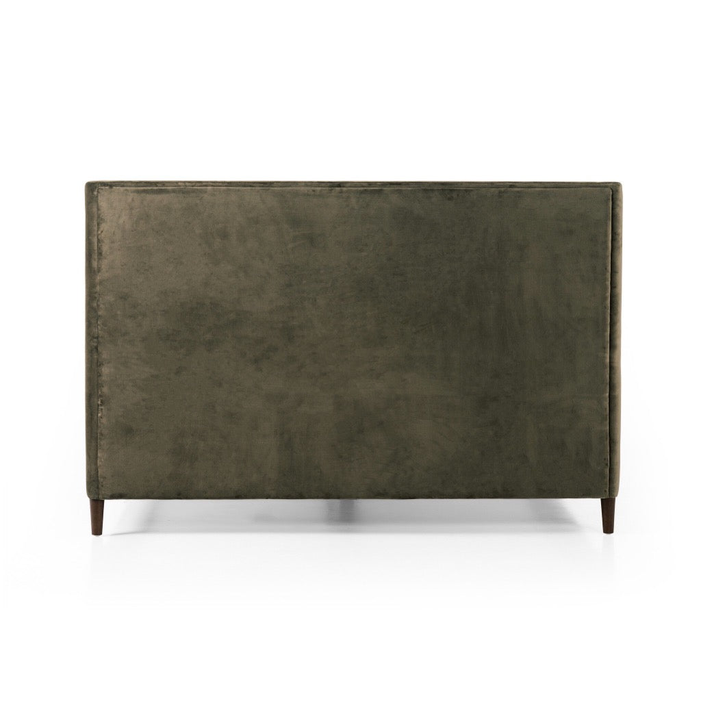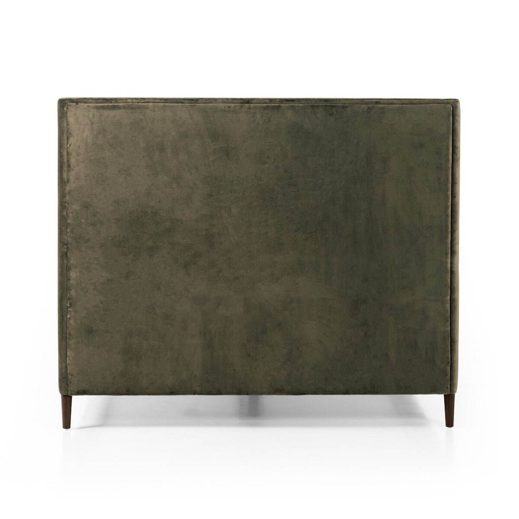 Upholstered in a velvety olive with subtle highs and lows that change in appearance depending on the direction of the fabric's nap. Fixed headboard cushioning for adds texture and comfort, while tapered oak legs lend a low-profile look.