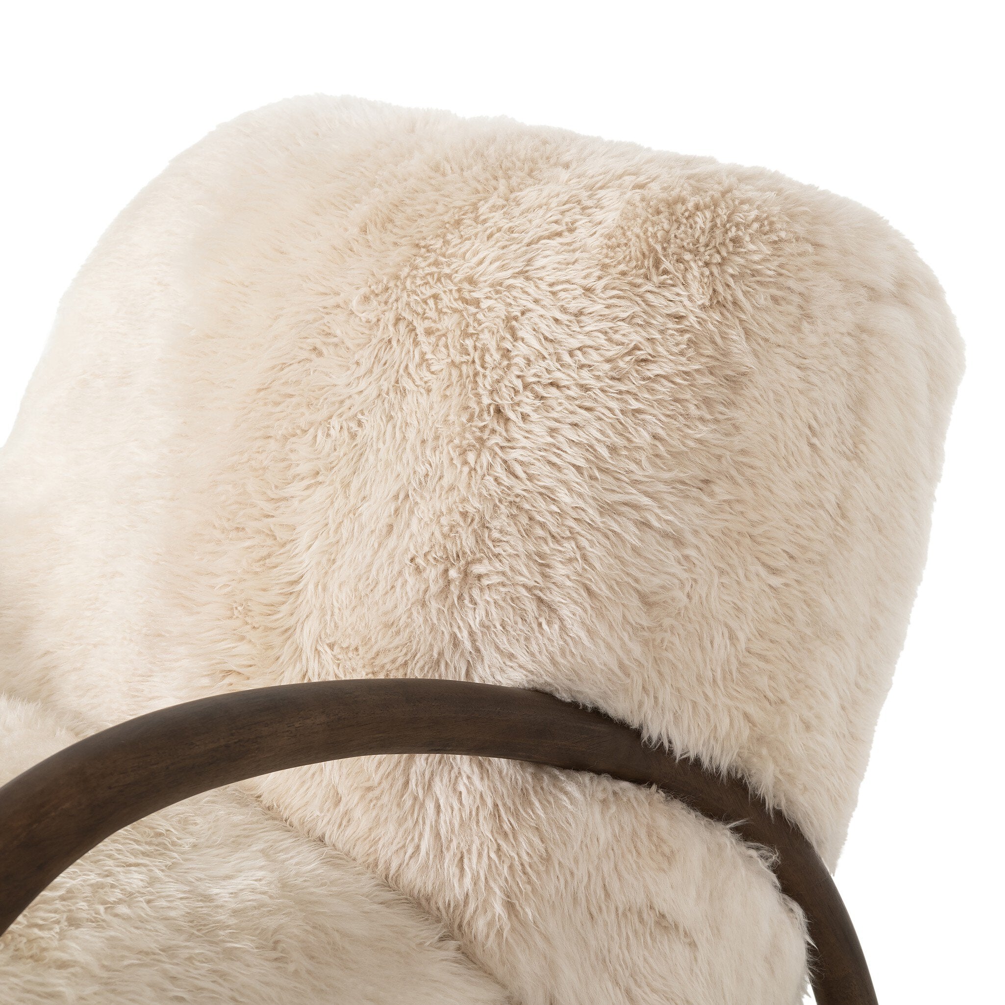This versatile accent chair is upholstered in a faux Mongolian shearling with a textural high pile. A contrasting, chunky parawood frame hugs the seat and is wire-brushed for a warm, vintage feel.