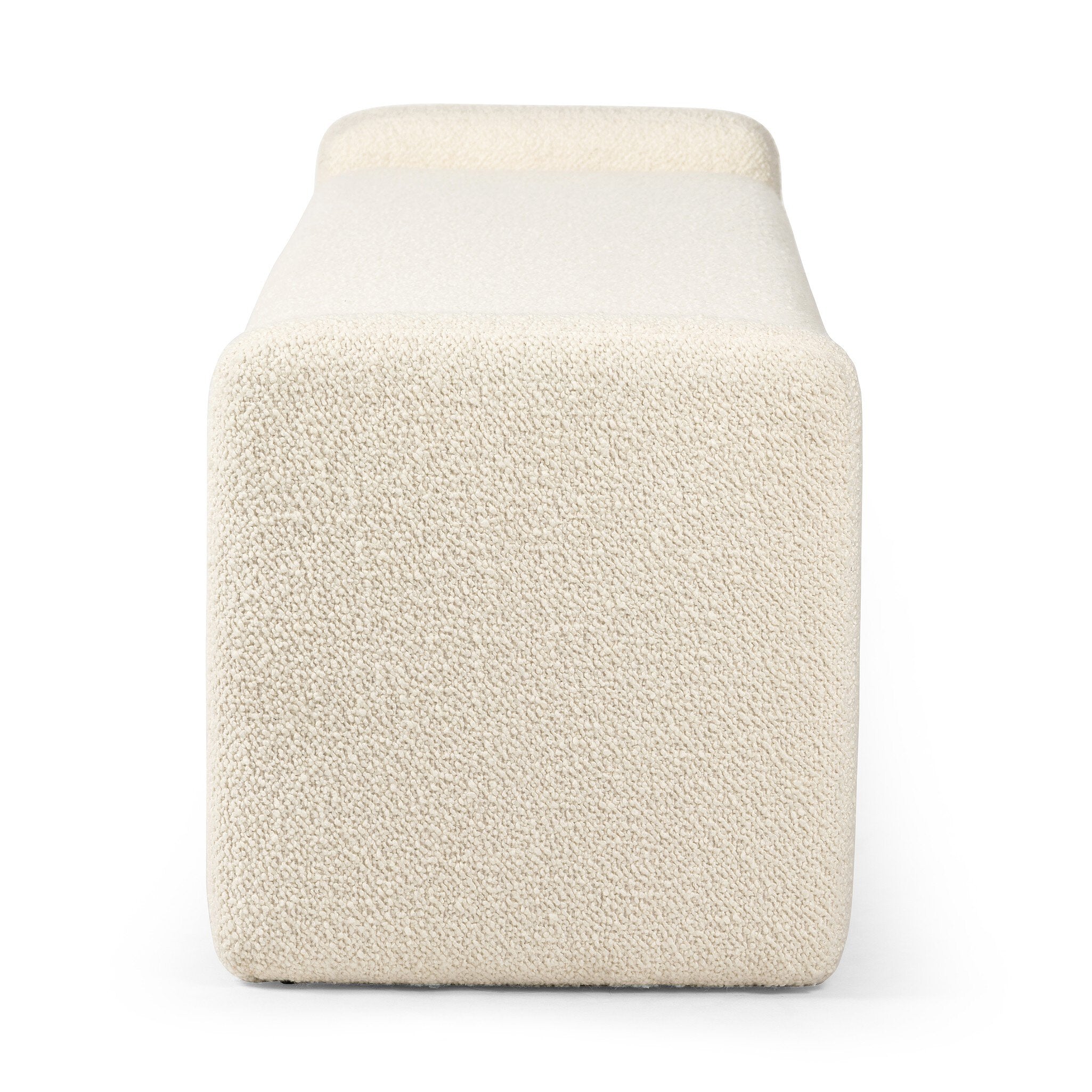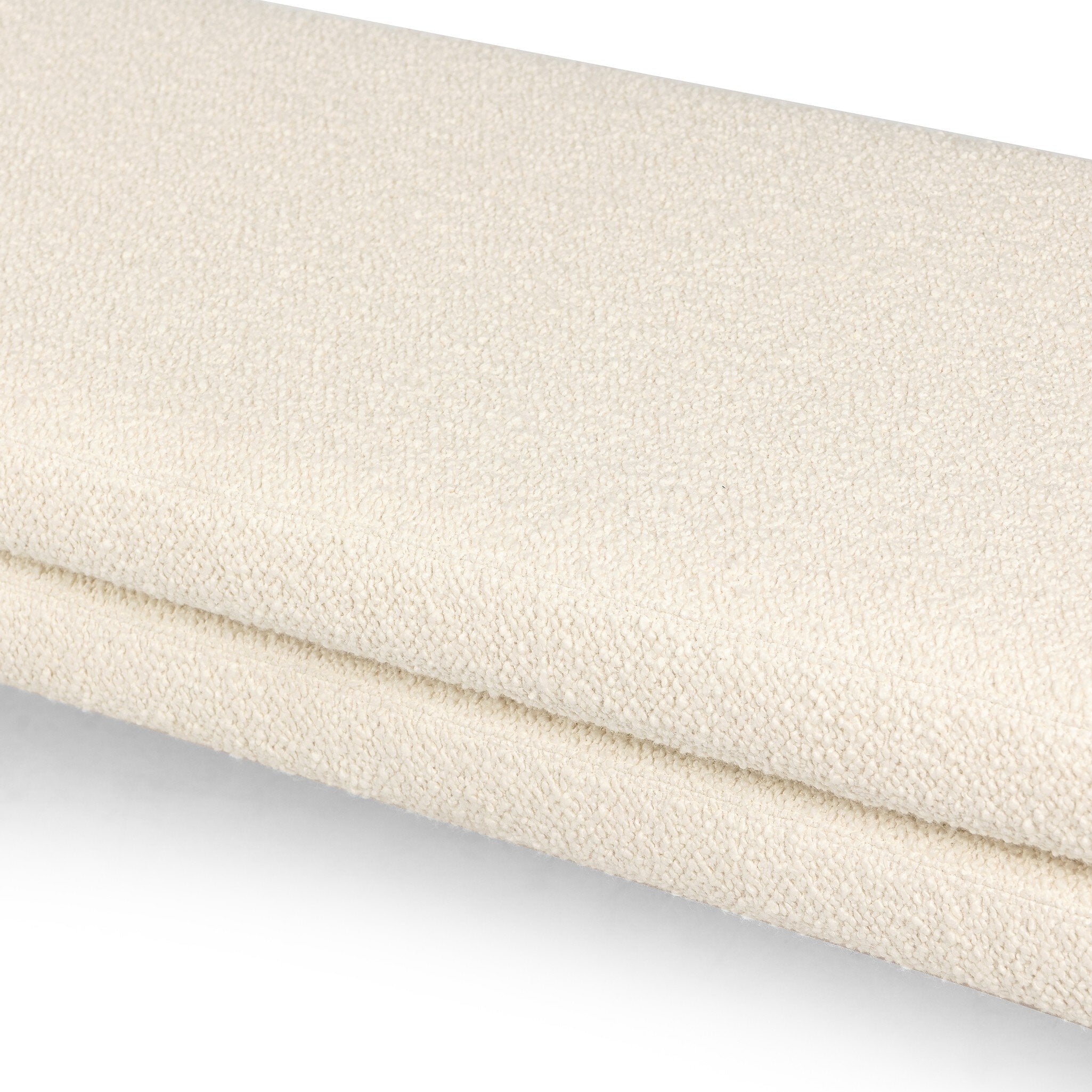 Cream, boucle-like upholstery covers a long, sophisticated dining bench.