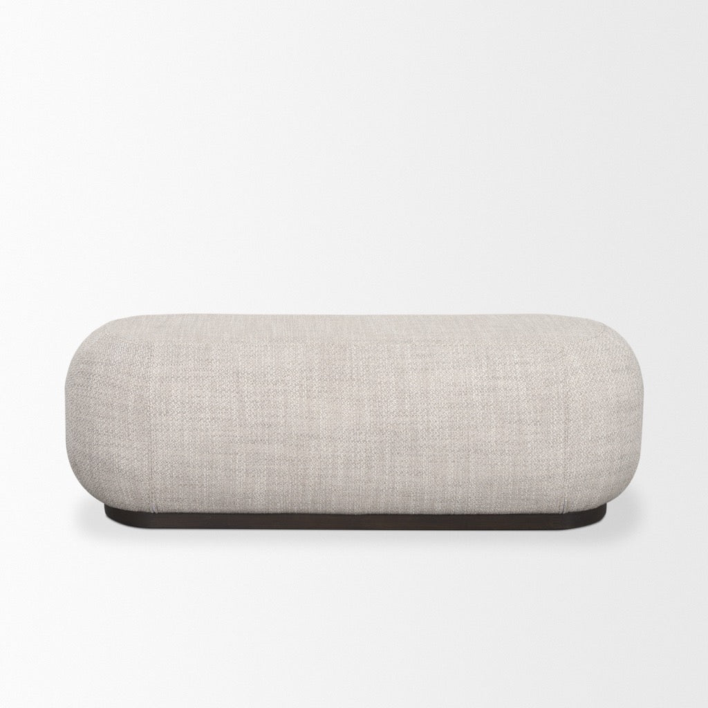 The Siren Bench features a gray upholstery, enveloping a solid structured cushioned seat, grounded with a dark brown wood base.
