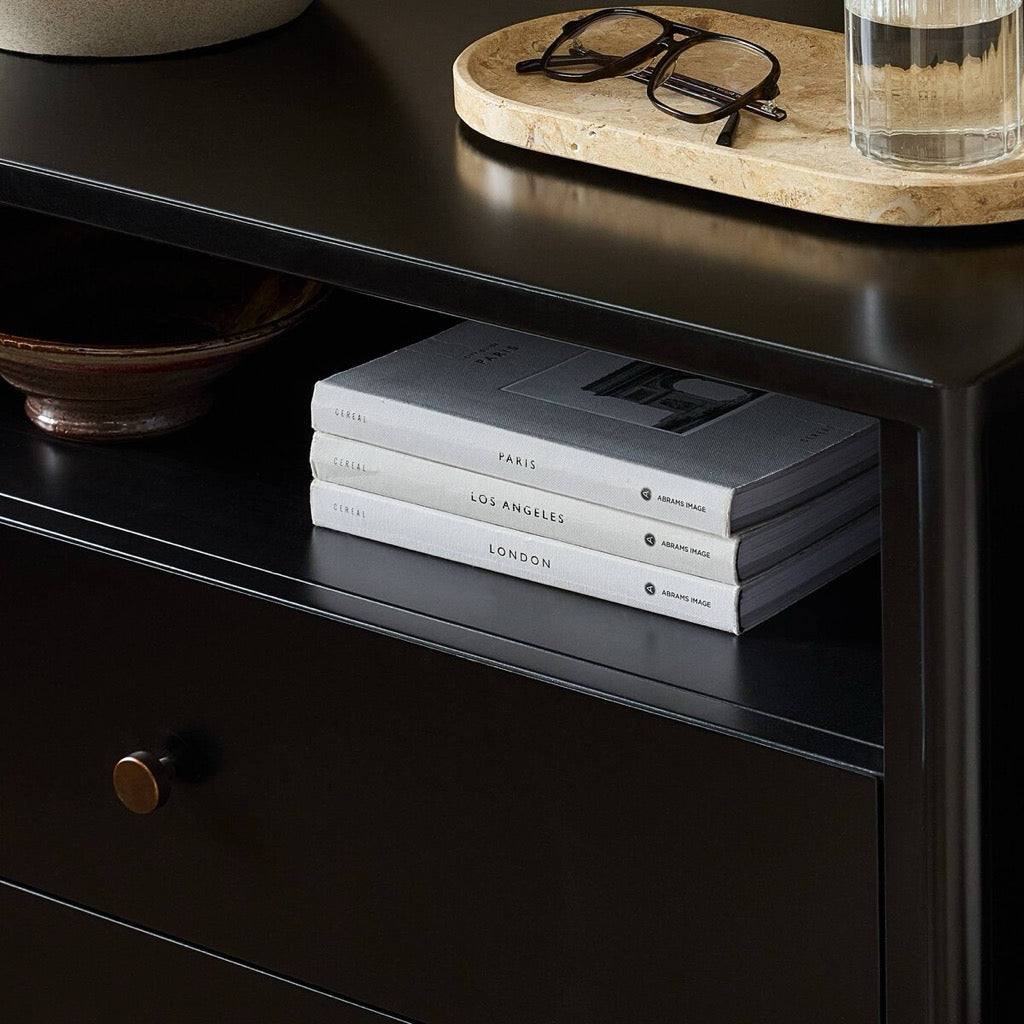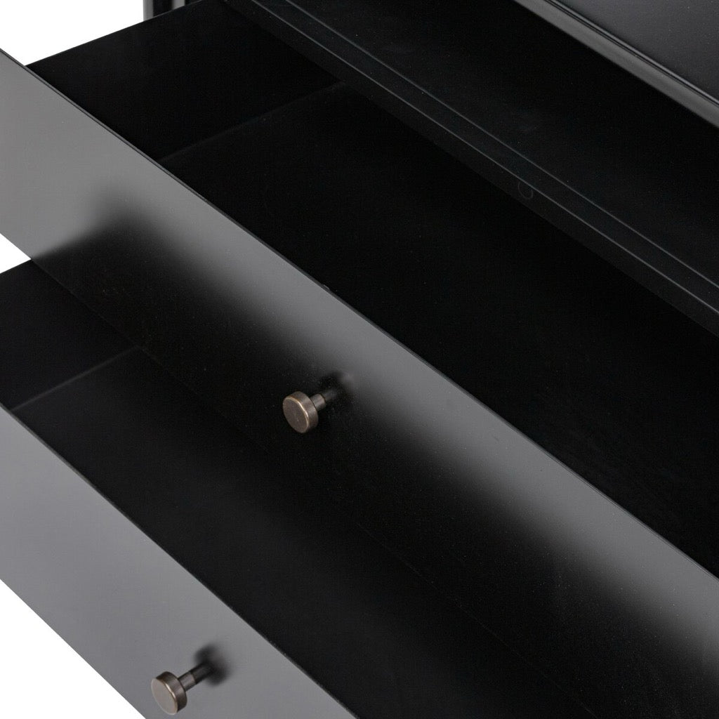 Bring a softened industrial look to the bedroom with a clean-lined nightstand of black-finished iron, finished with simple bronzed iron hardware. Two drawers and an open cubby bring ample storage to the bedside.