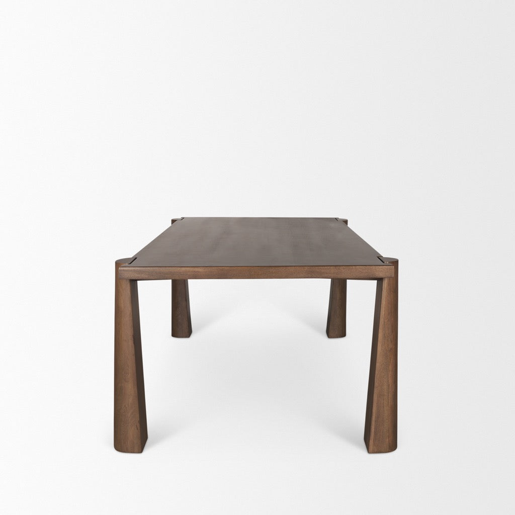 The Tammar Dining Table is meticulously crafted from smooth-textured mango wood and finished in a rich medium brown. Its rectangular tabletop is supported by four striking exaggerated angled legs that are tapered and finished with soft, organic curves that add unparalleled character and substantial presence to any dining space.