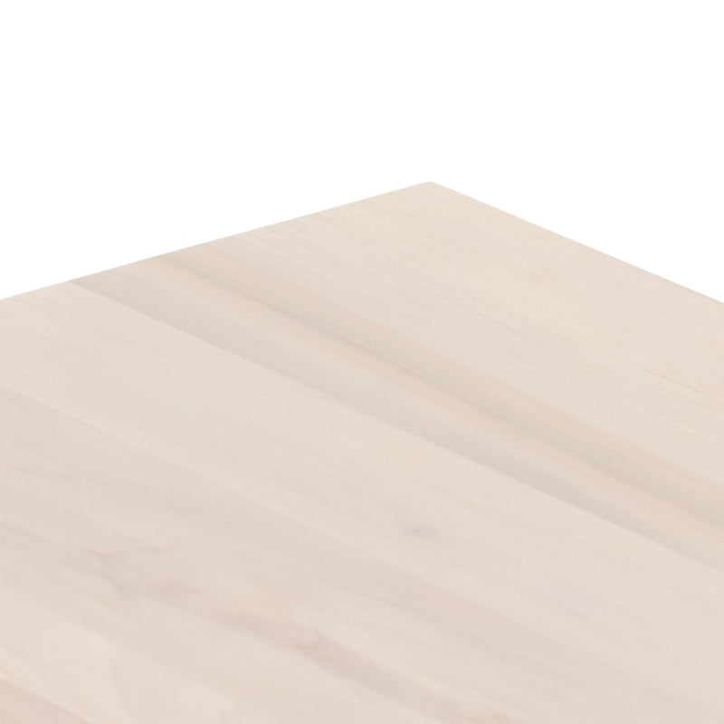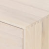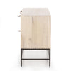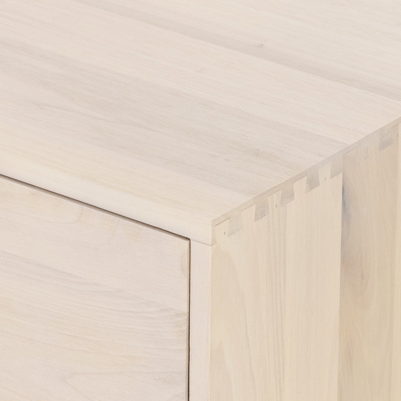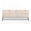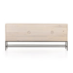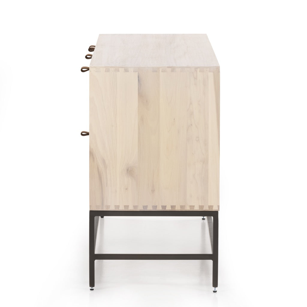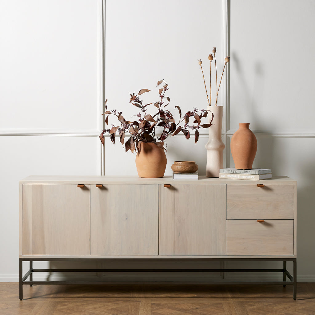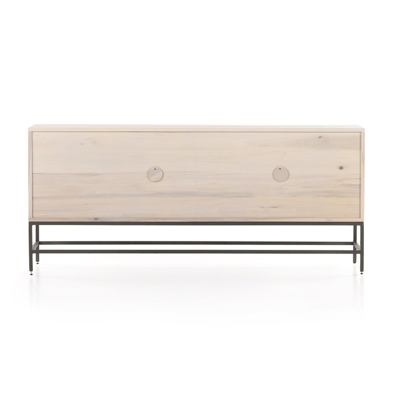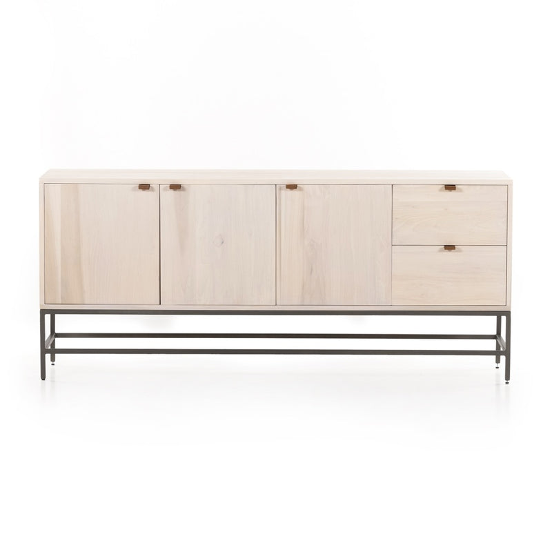 Inspired by clean midcentury design, a stylish sideboard of light-washed solid poplar offers plenty of storage space thanks to roomy cabinetry plus dual drawers. Metal-secured pulls of top-grain leather add a textural element of surprise.