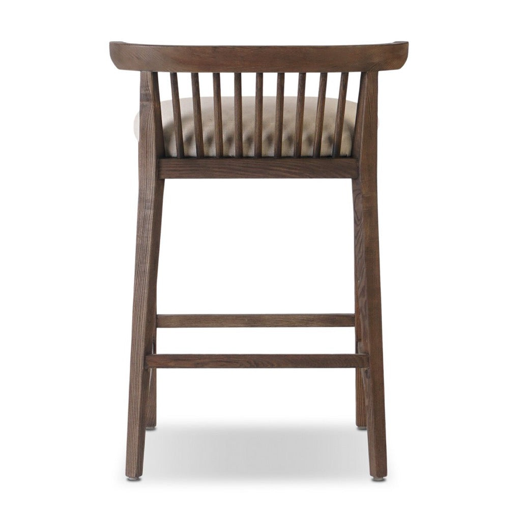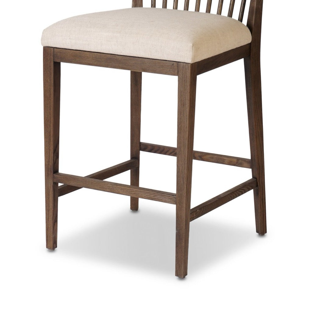 A low, linear counter stool inspired by Japanese tea houses, crafted from natural ash. Designed for comfort, a thick cushion seat is upholstered in a casual poly-linen blend.