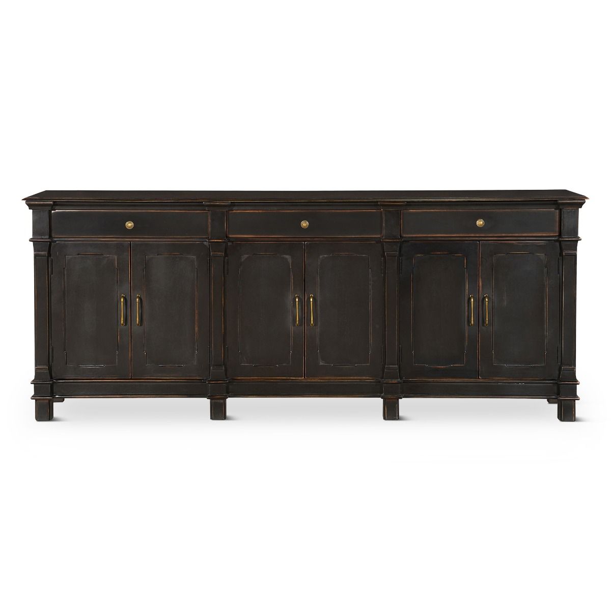 The Turin 100" Sideboard offers a timeless silhouette with a distressed black finish, warm walnut-stained interior, and classic gold brass hardware. With generous storage behind paneled doors and traditional detailing, this substantial piece blends elegance and function. A refined choice for designers and wholesale retailers seeking high-quality casegoods with lasting appeal.