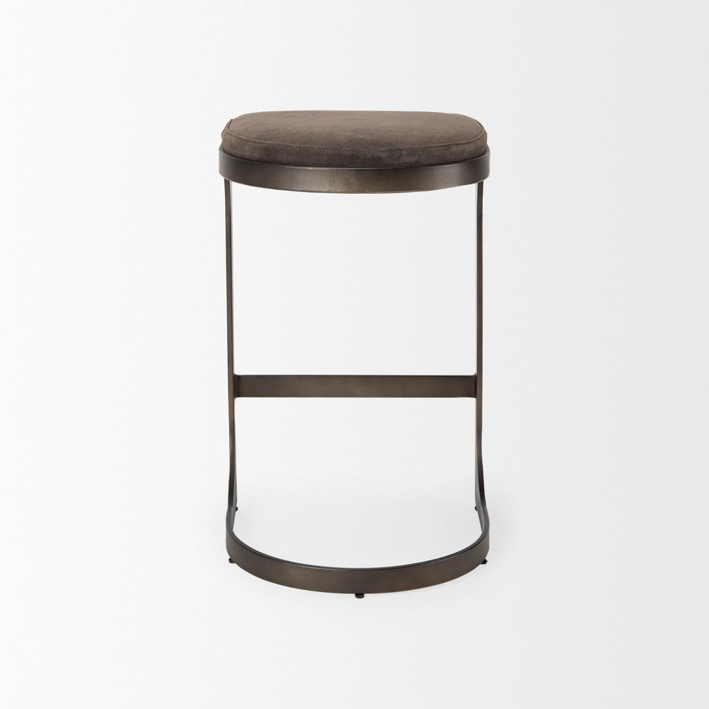 The Tyson is a stool featuring a unique metal frame and a backless suede seat.