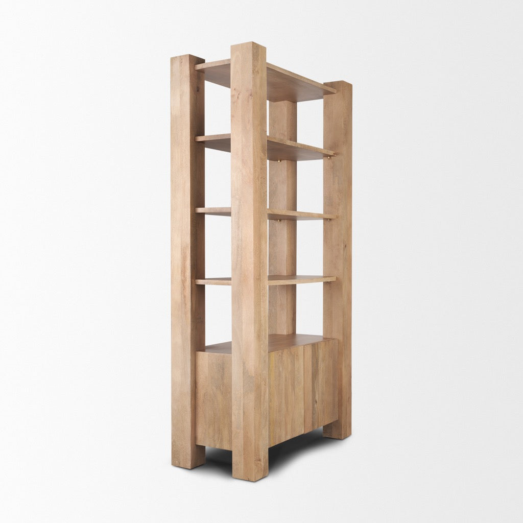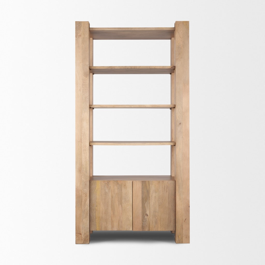 The Beth Shelving Unit is constructed from mango wood and has four open shelves, and two cabinet doors that open to two internal shelves.