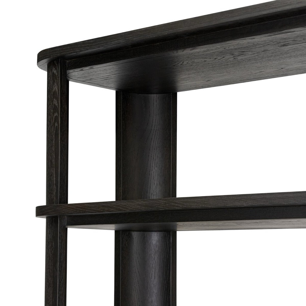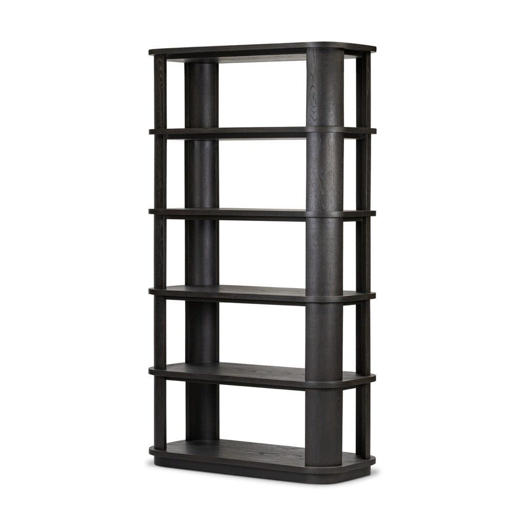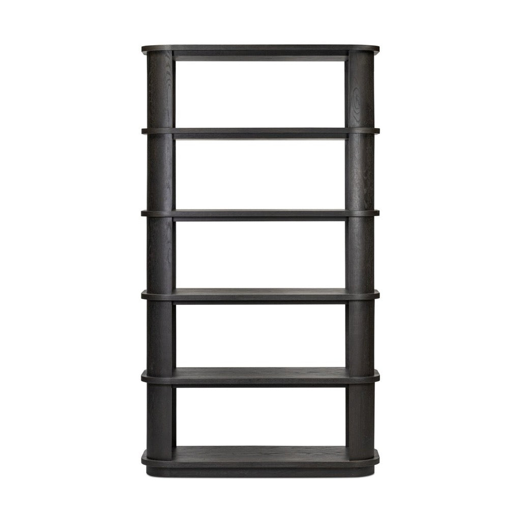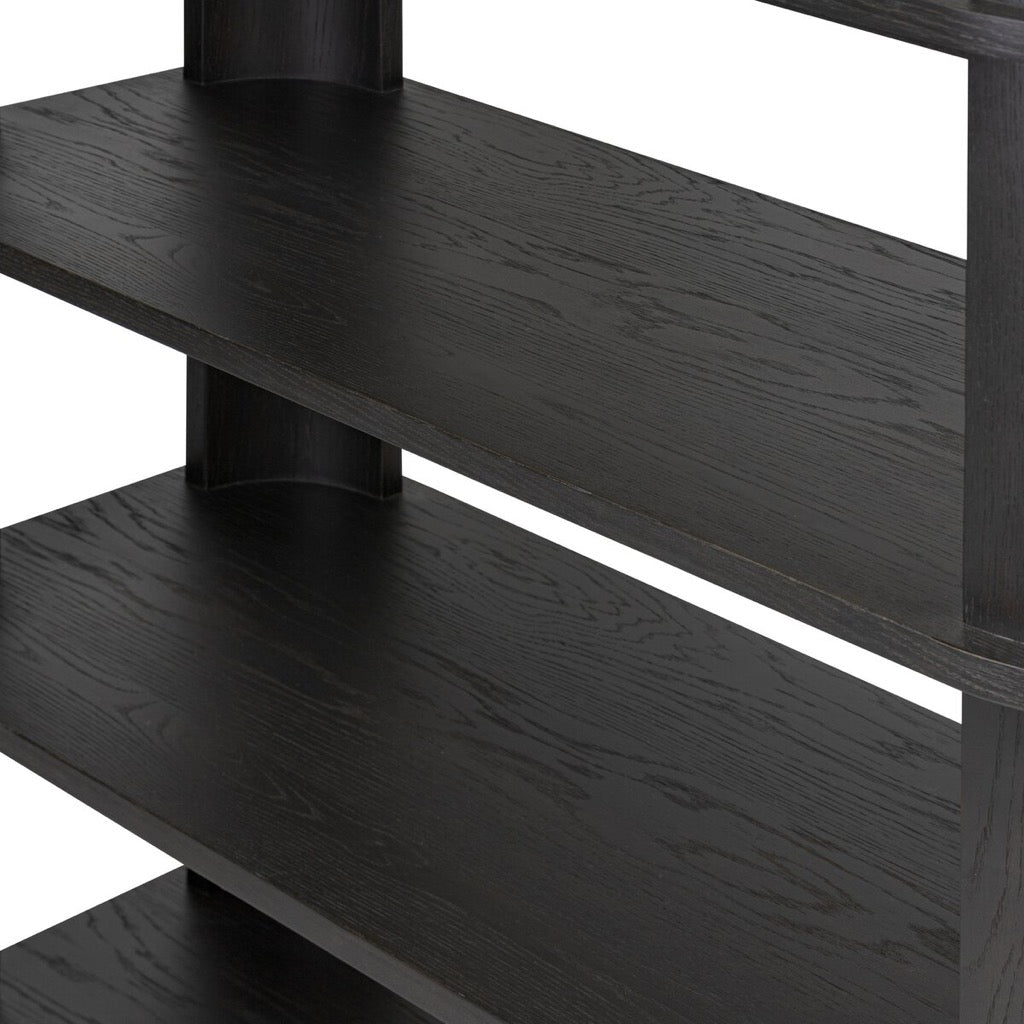 Unexpected contours give this bookcase its warm, modern vibe. Crafted oak veneer with a worn black finish, rounded legs are inset from the shelves with a plinth-like effect.