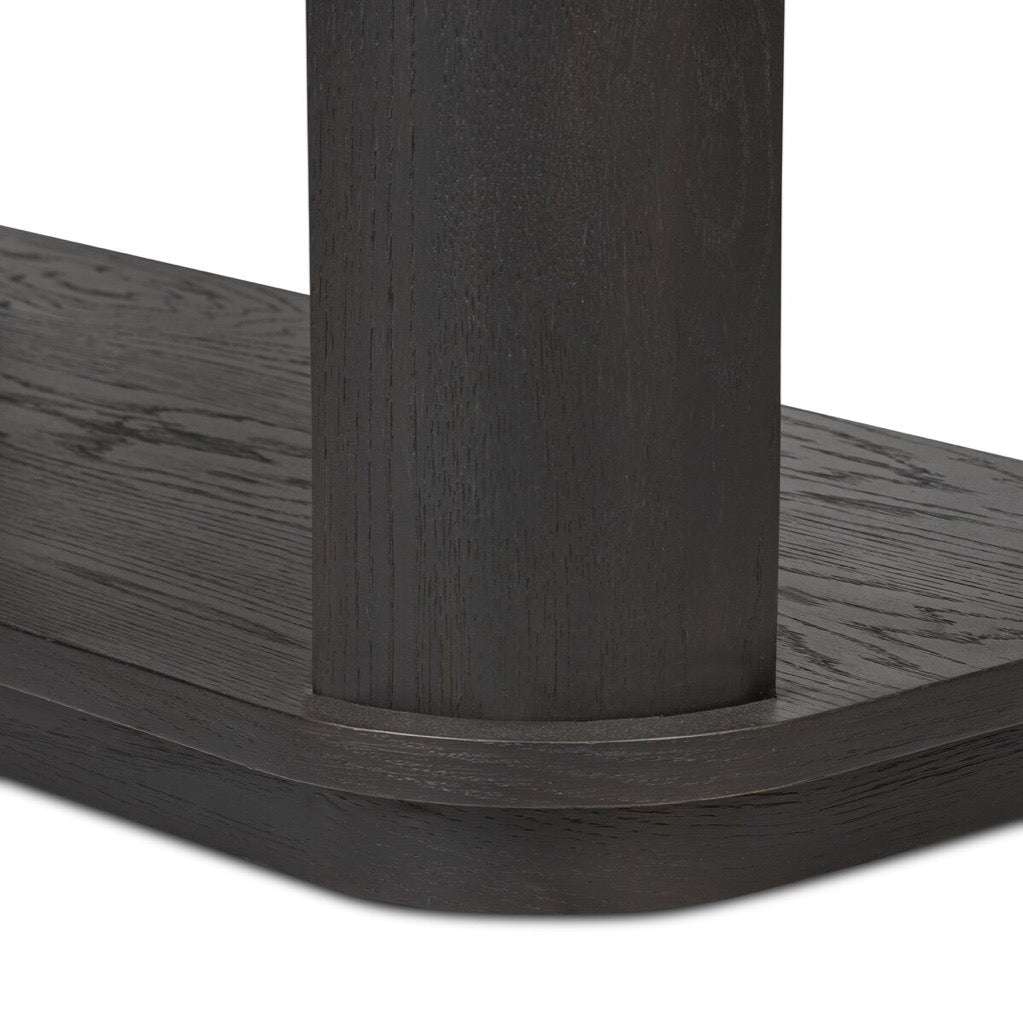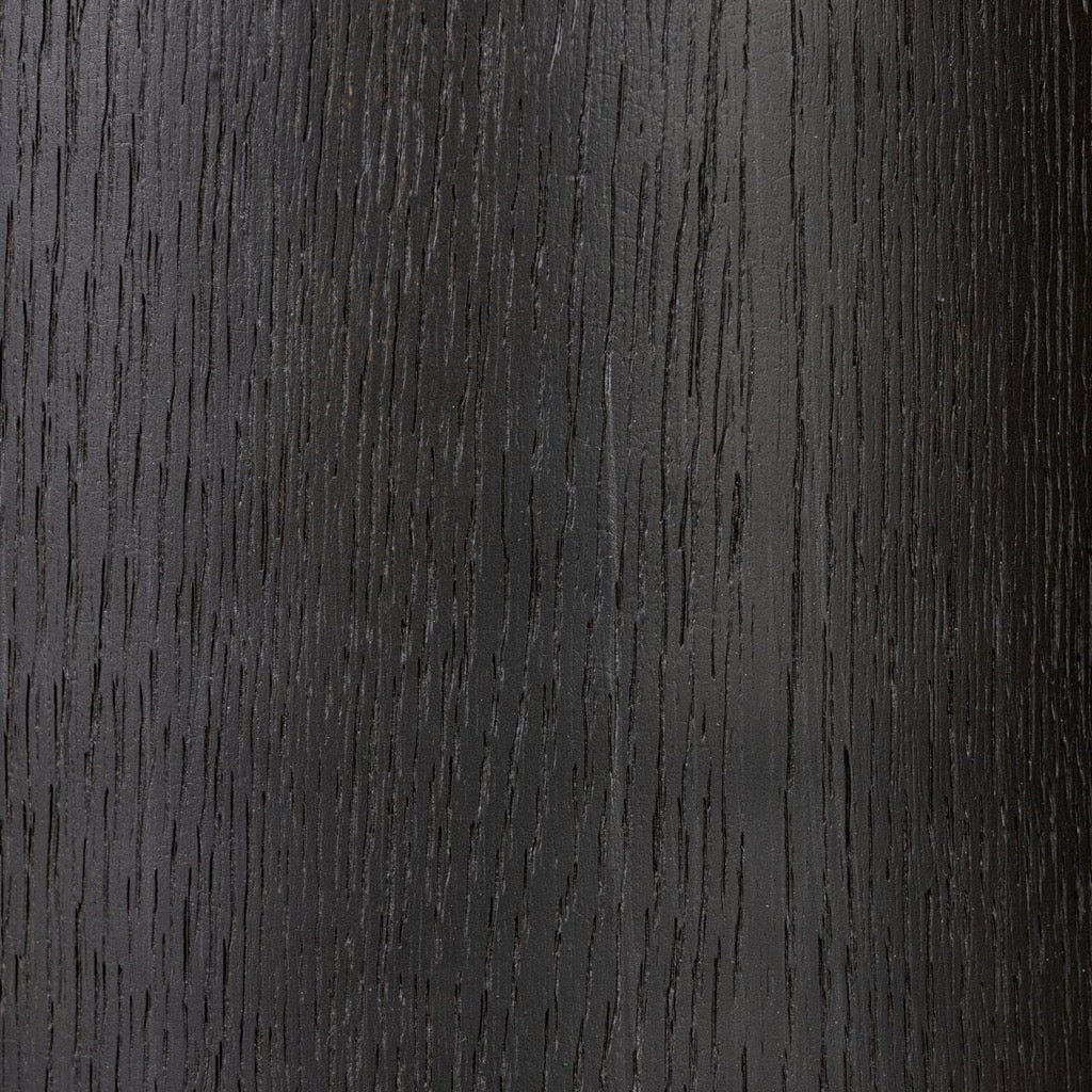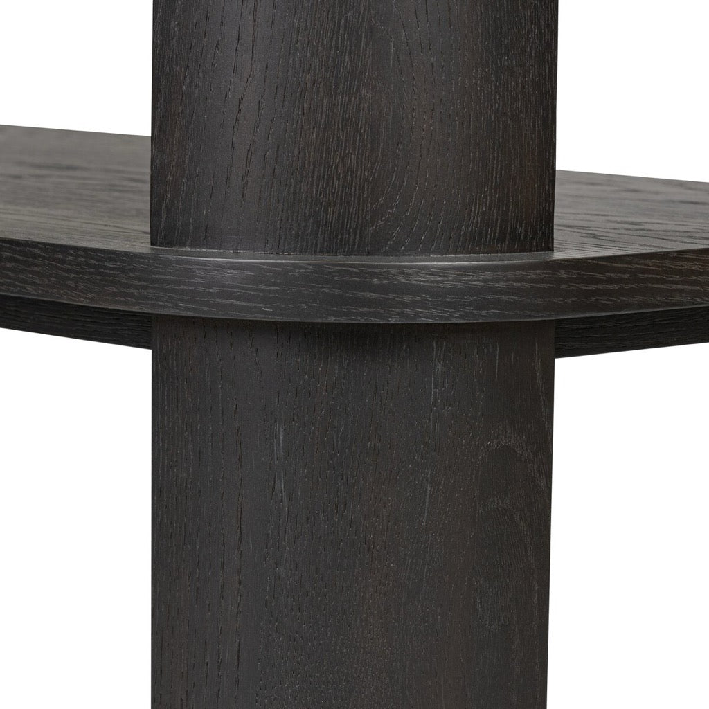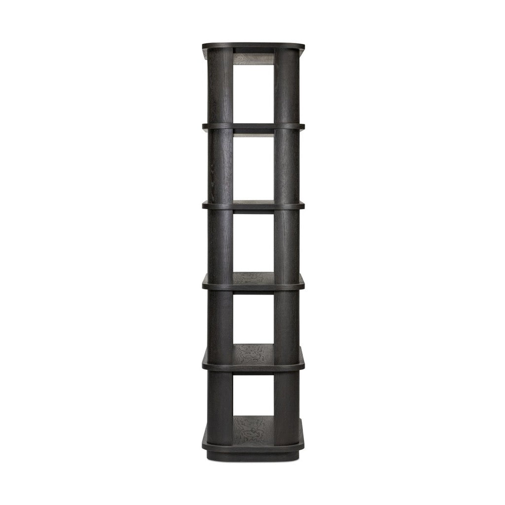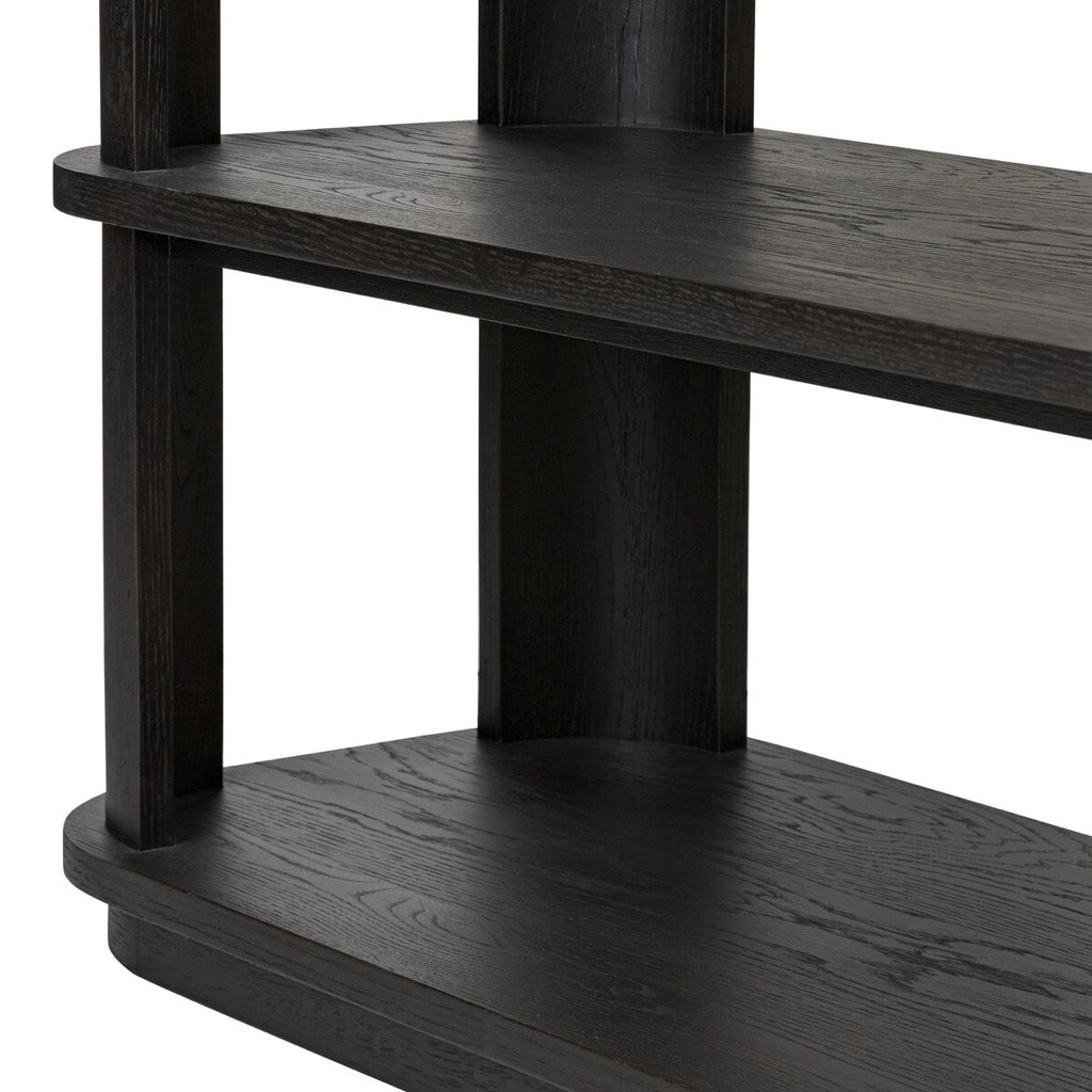Unexpected contours give this bookcase its warm, modern vibe. Crafted oak veneer with a worn black finish, rounded legs are inset from the shelves with a plinth-like effect.