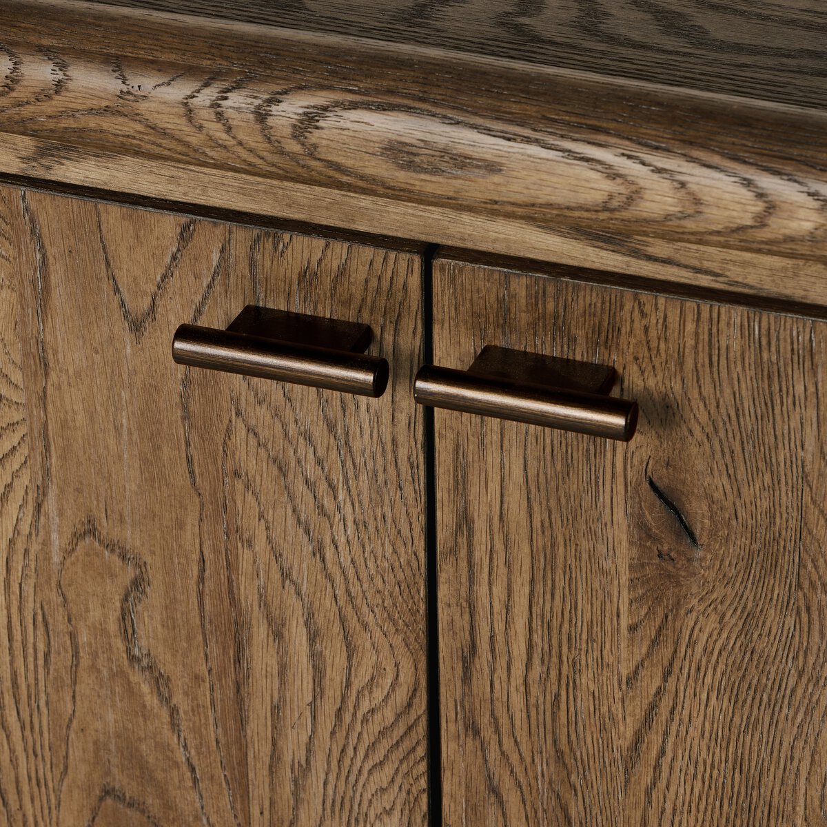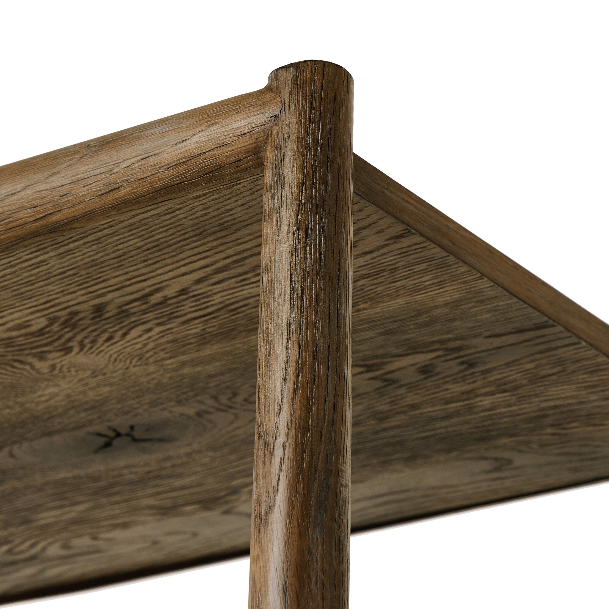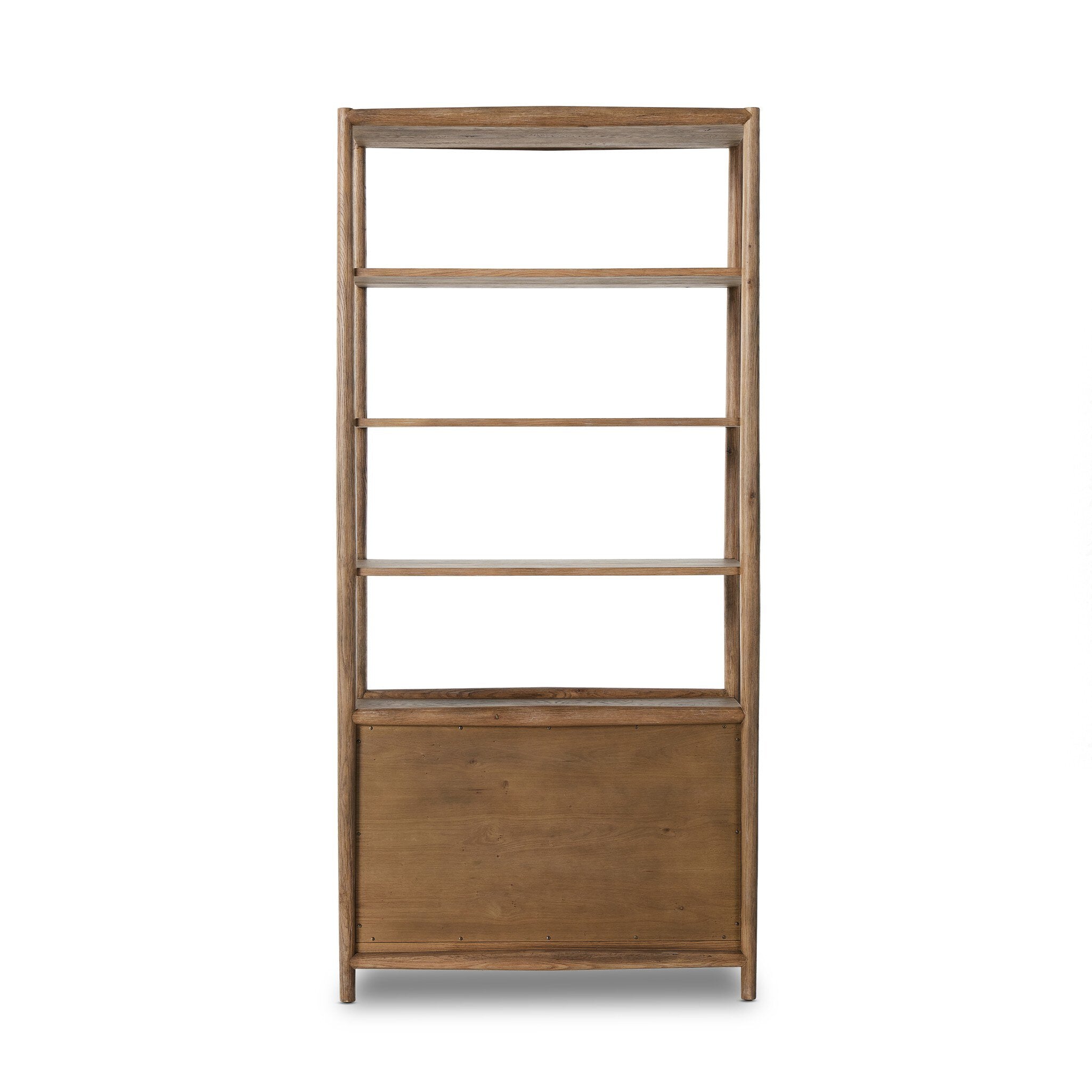 A rustic oak bookcase with fixed shelves shapes subtly curved corners, bringing a handcrafted look to a minimalist form. Simple hardware is finished in an aged bronze.