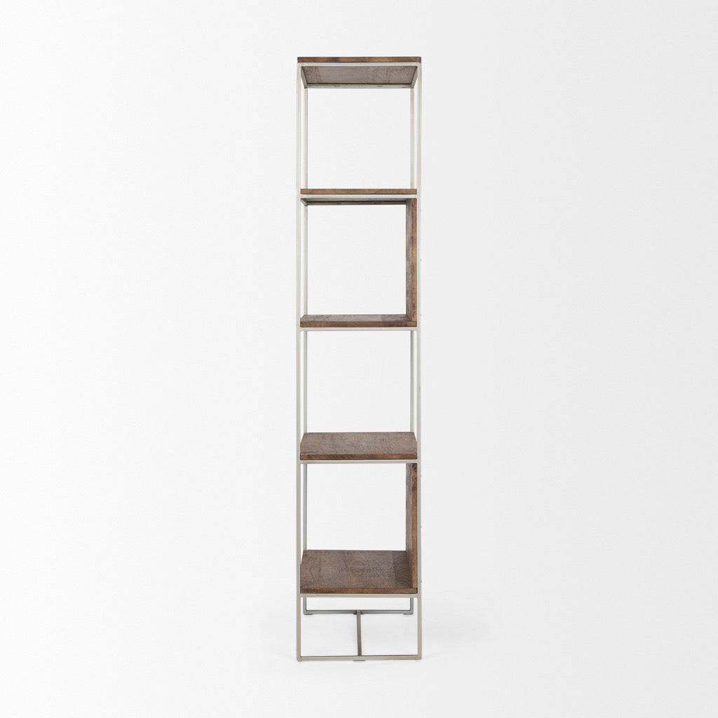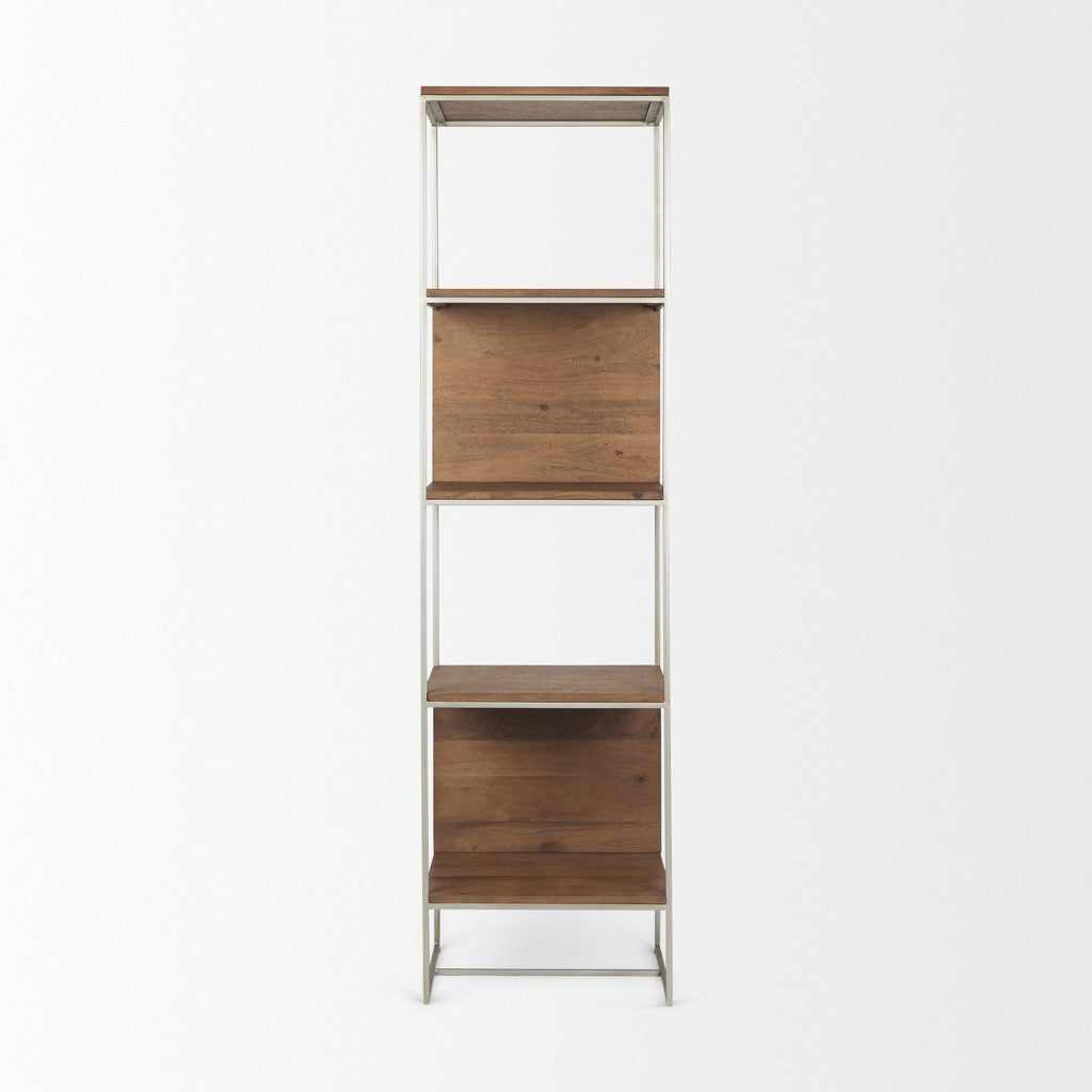 The Morris is a spectacular shelving unit crafted from wood and metal. It features four wooden shelves braced by a metal frame.