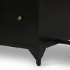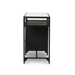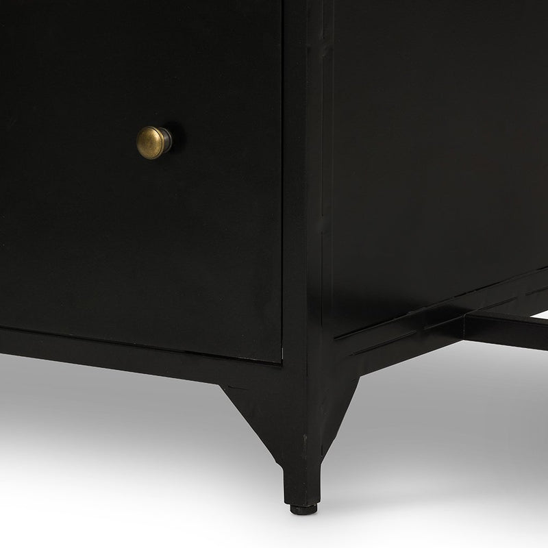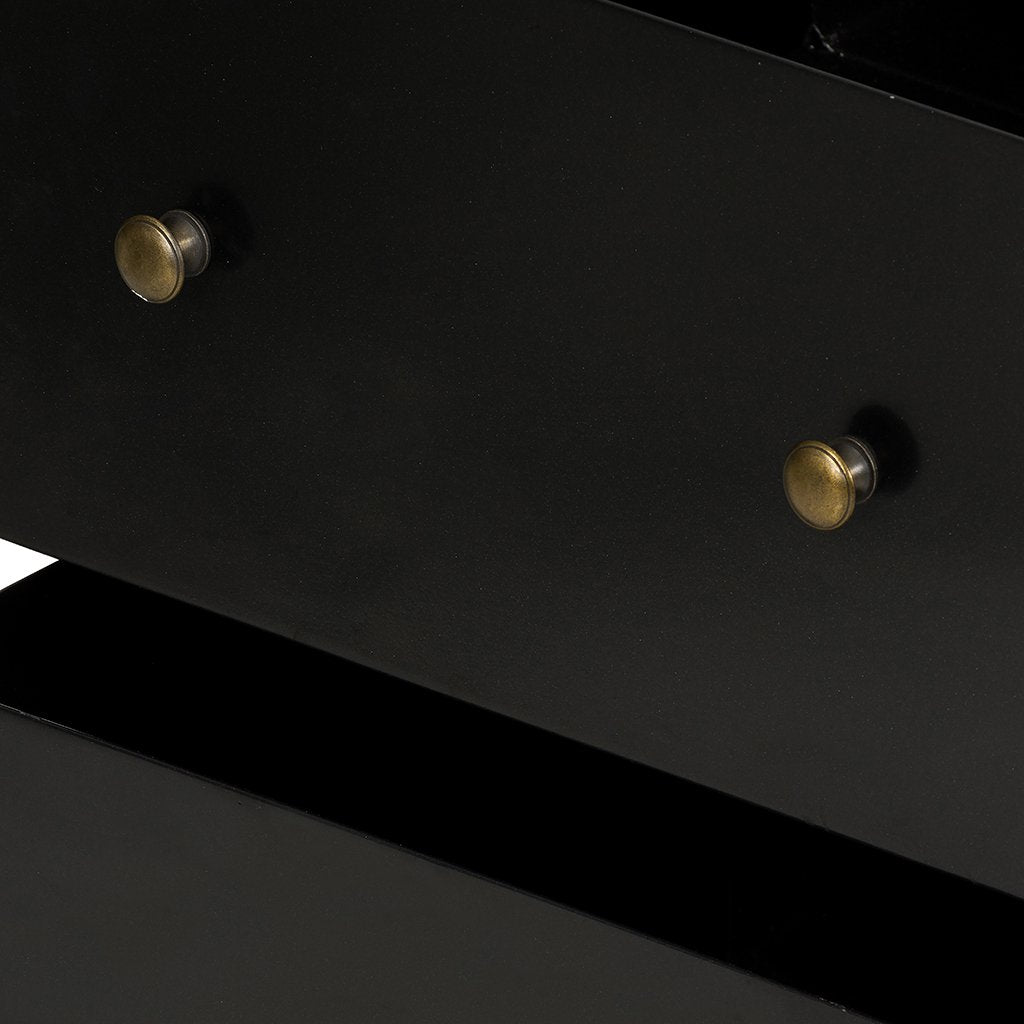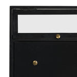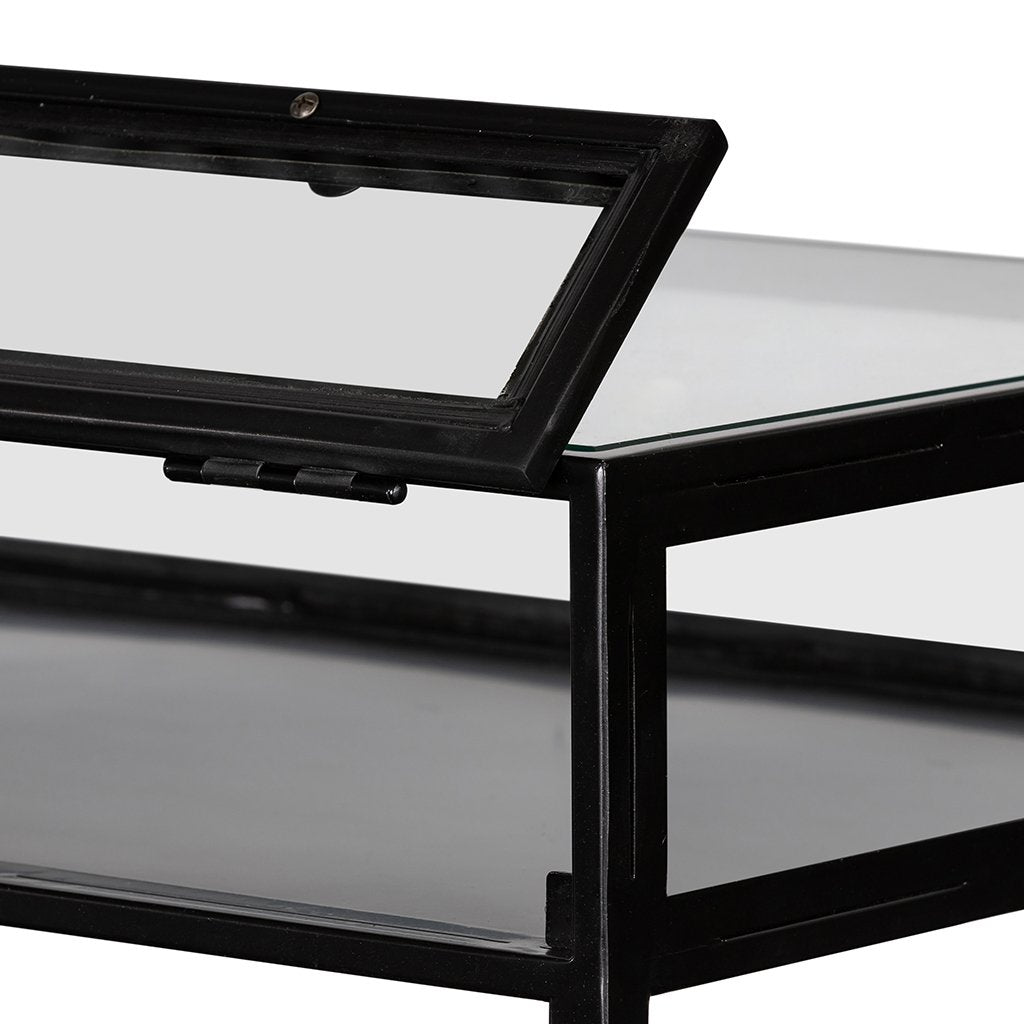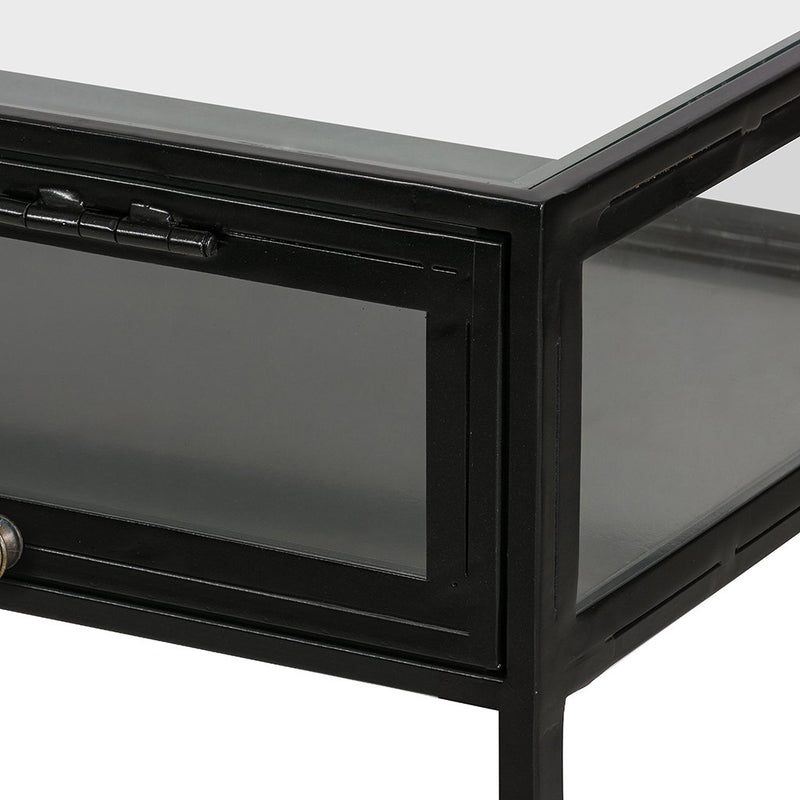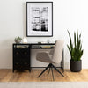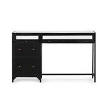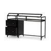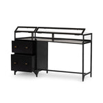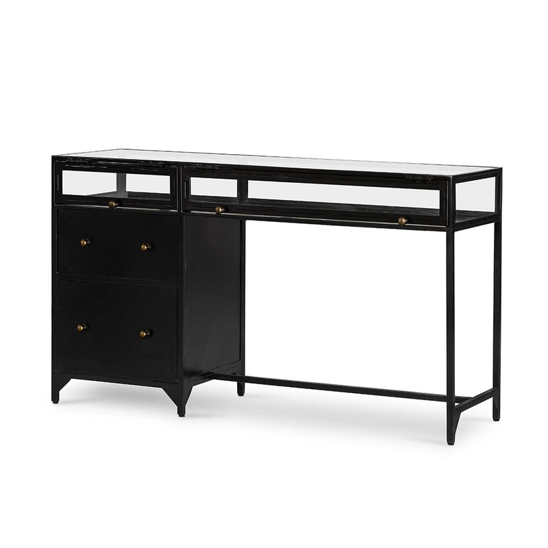 The shadowbox-style desk balances work with play. Display prized possessions in a glass enclosure with matte-black metal and brass knobs. File drawer for handy storage of legal and letter sized documents.