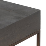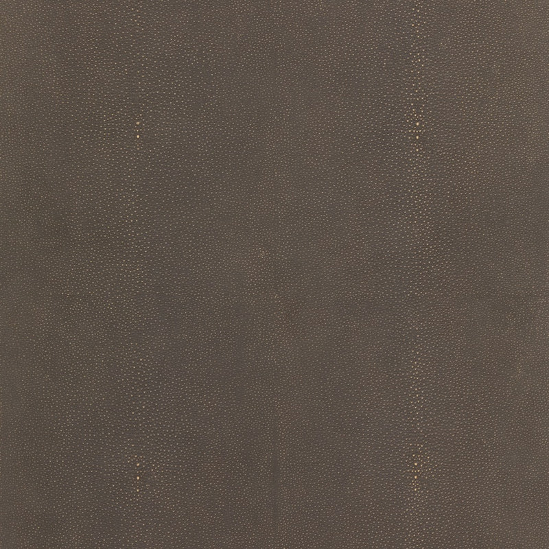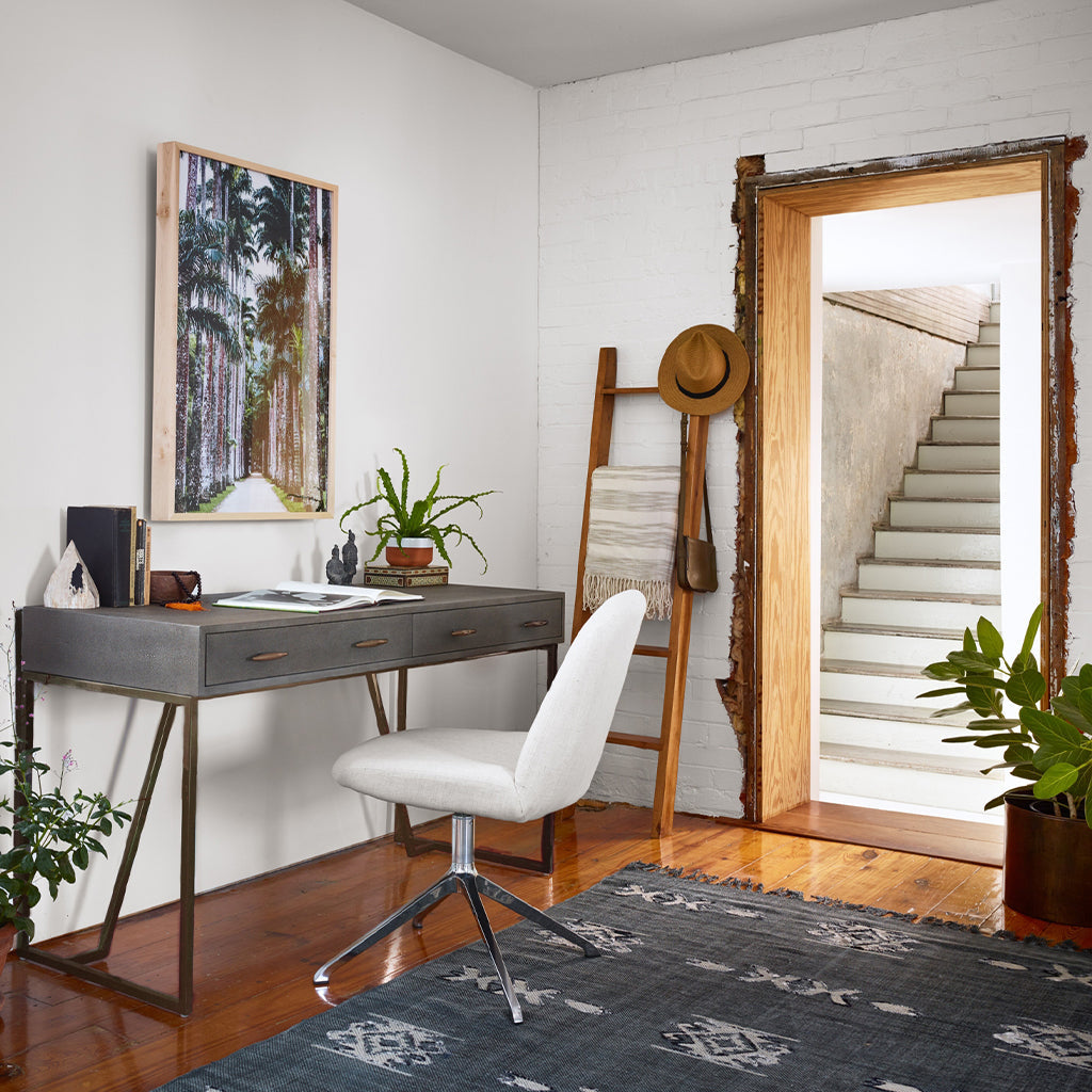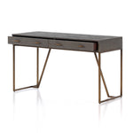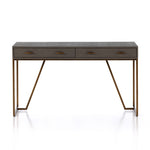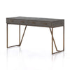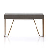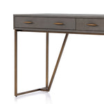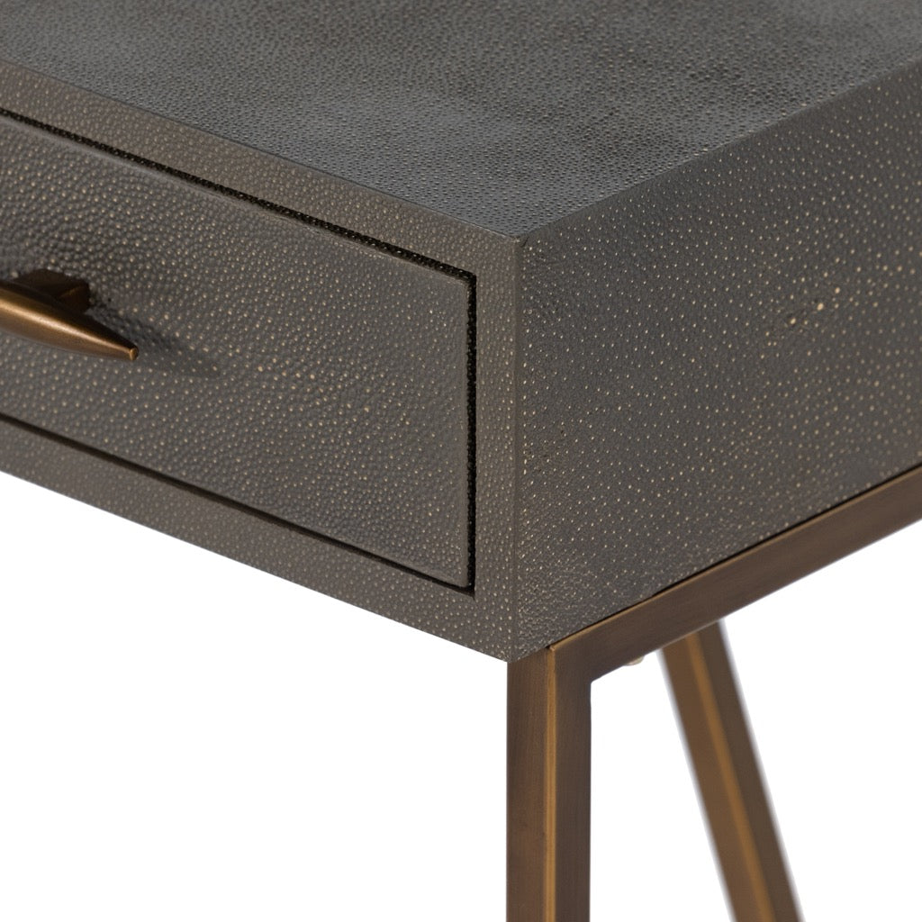 Scaled for utility, textured for style. A grey faux shagreen top floats over a shiny, angular iron base finished in an antique brass.